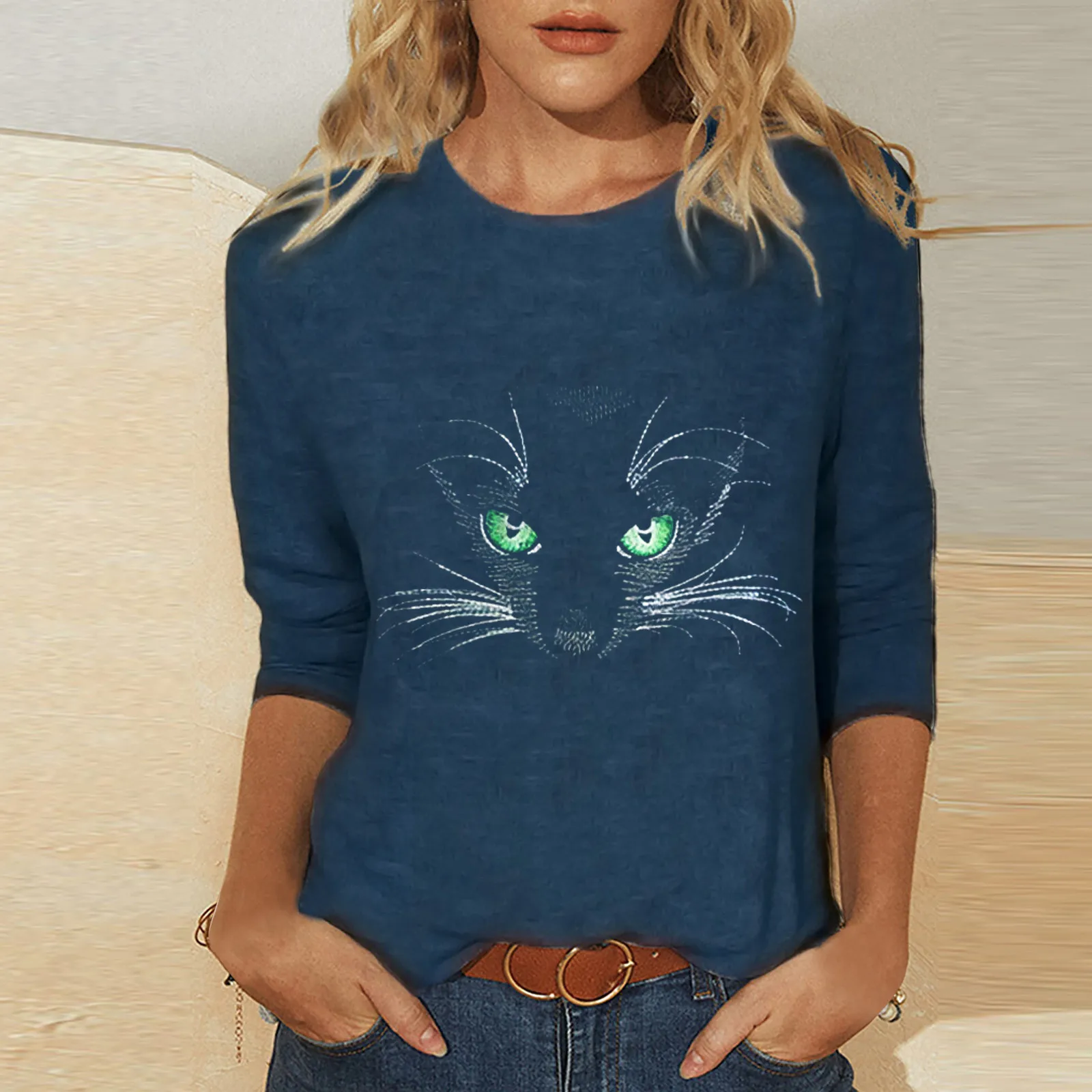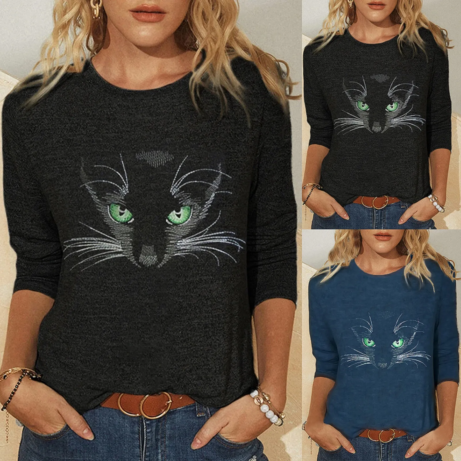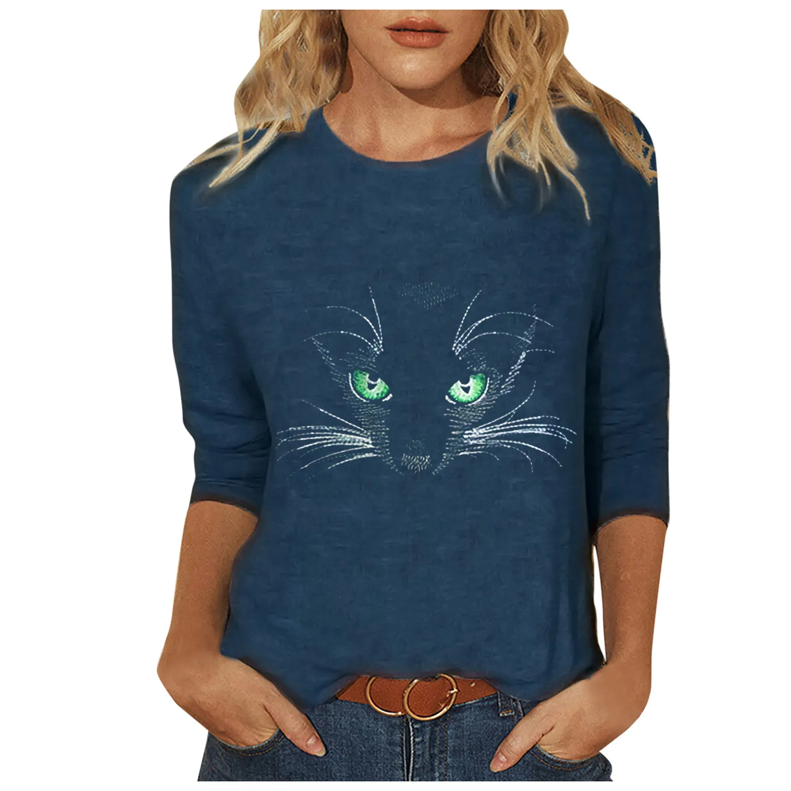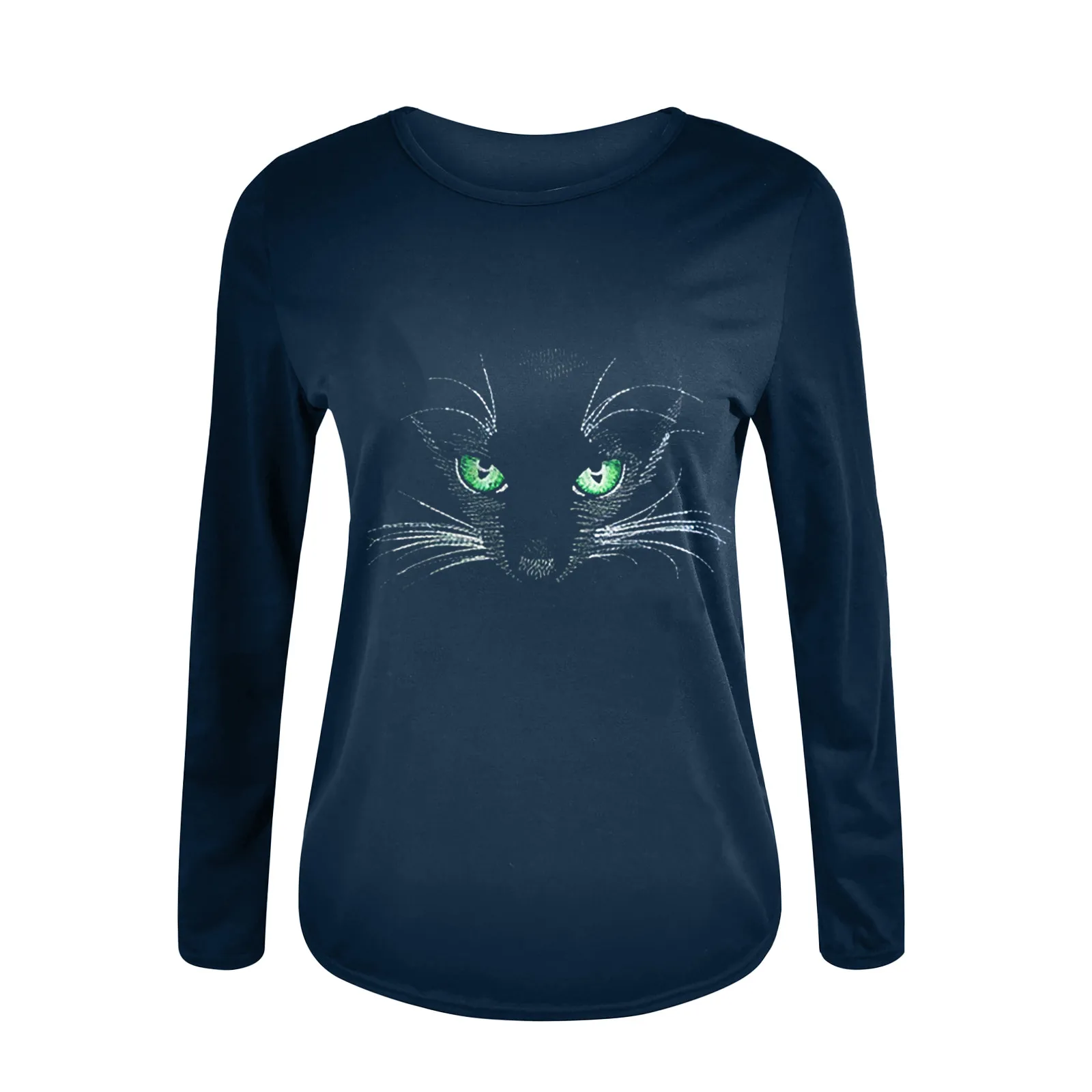 Женская Повседневная рубашка с длинным рукавом и круглым вырезом с принтом кота