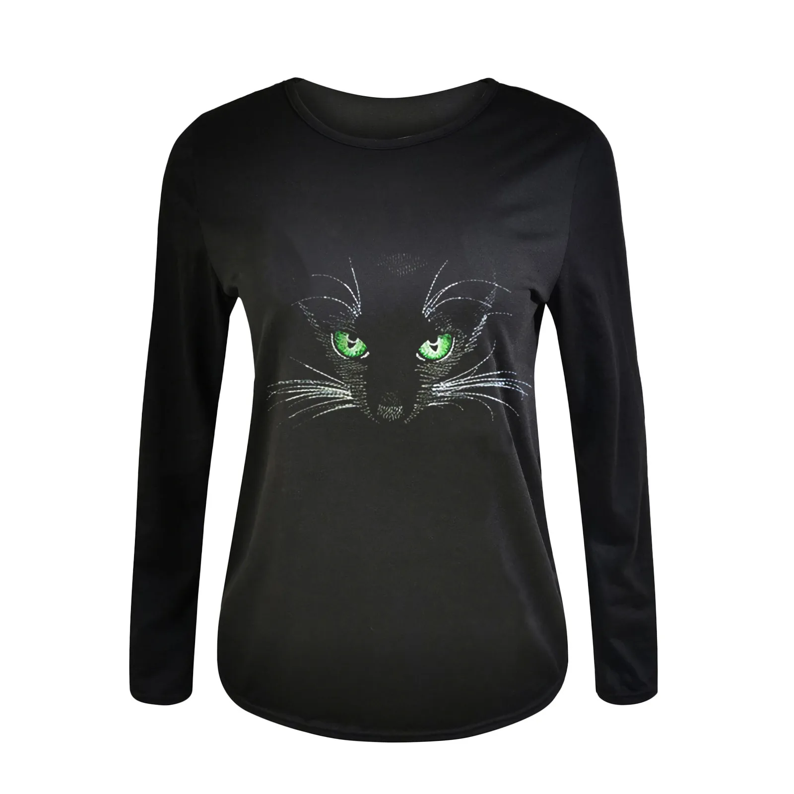 Новые женские футболки Harajuku, женские черные футболки с графическим рисунком, с длинным рукавом, с принтом кота, с круглым вырезом, топ, женская футболка