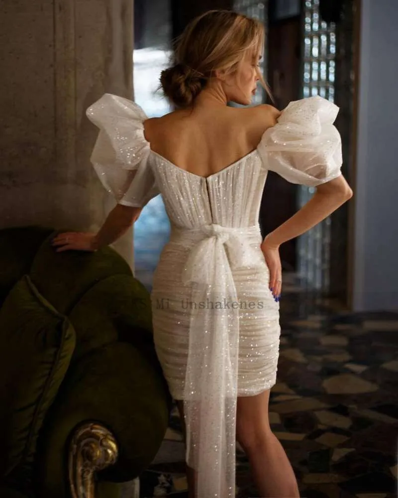 Женское Короткое свадебное платье выше колена, Привлекательное платье невесты с коротким рукавом-фонариком и ремнем, свадебные платья, 2021
