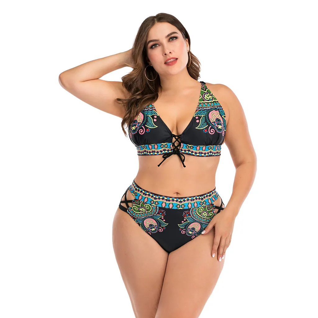 Женское бикини больших размеров 2021 mujer бандаж этнический принт мягкий бюстгальтер Высокая талия комплект бикини раздельный купальник пляжная одежда танкини