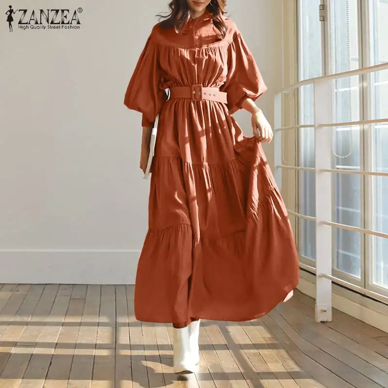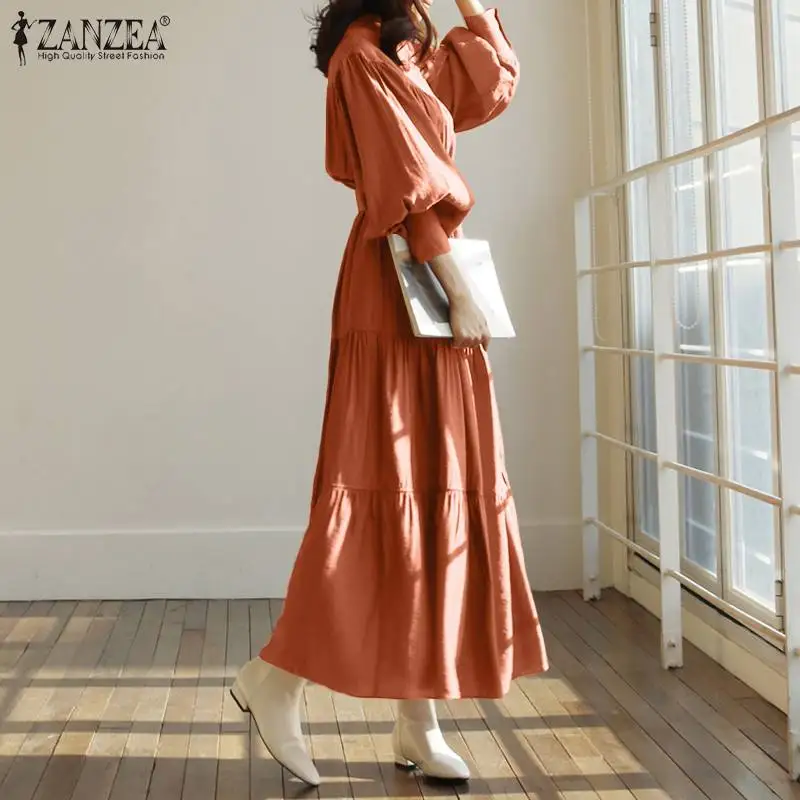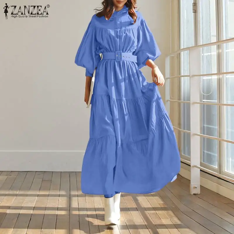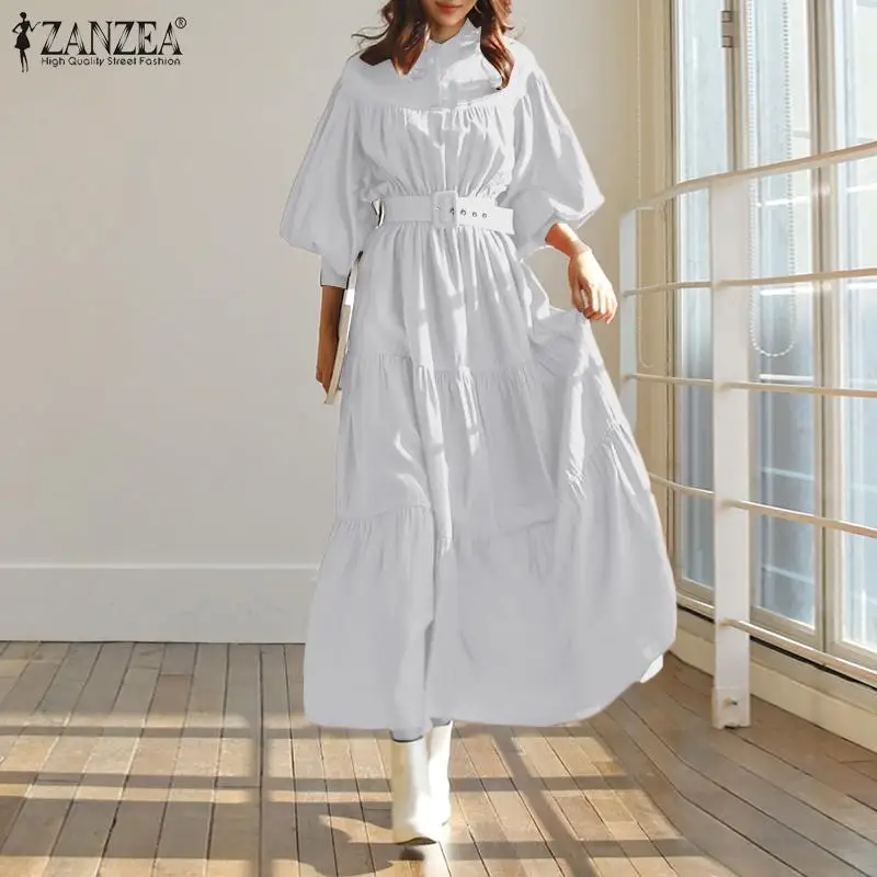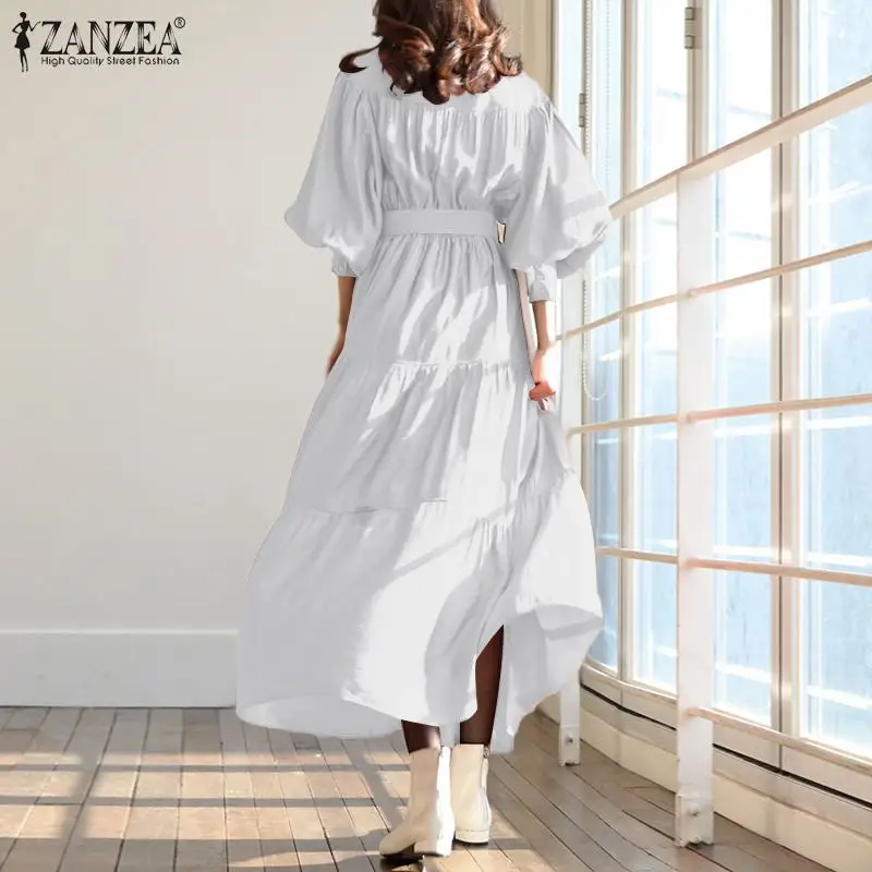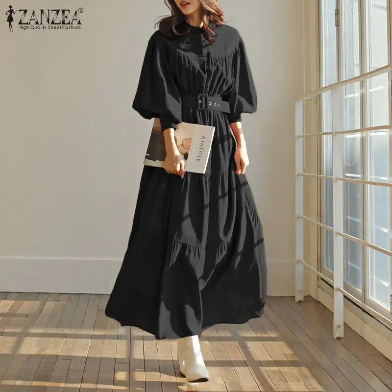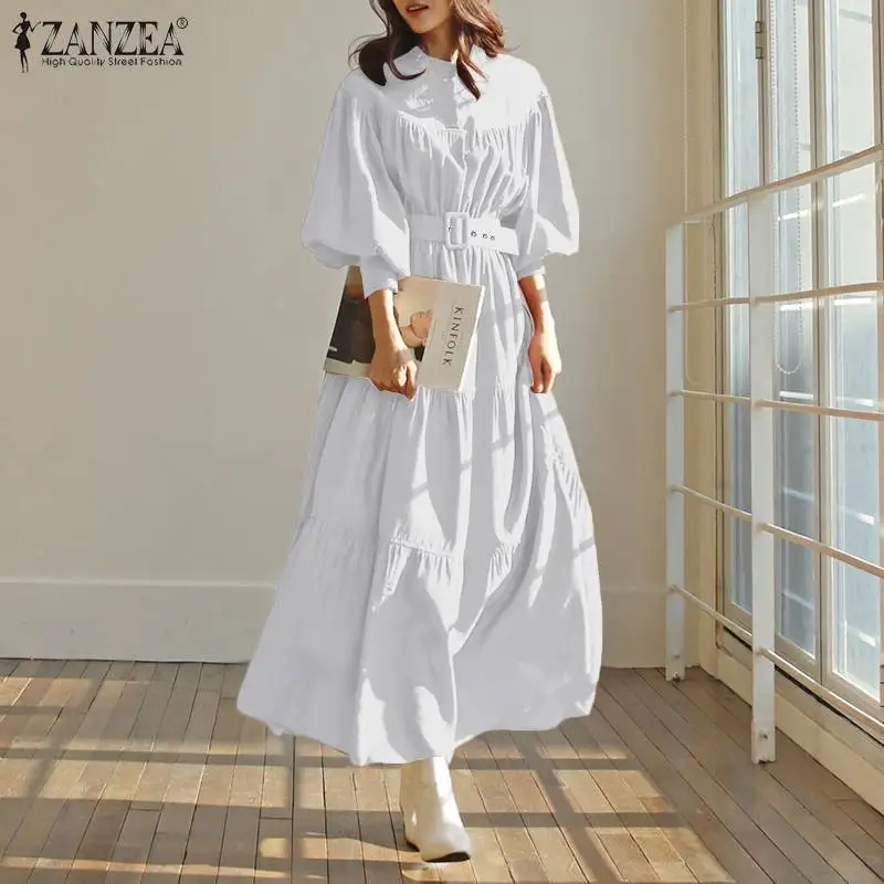 Женское Элегантное Длинное Платье макси с пышными рукавами 2021 ZANZEA, весенний сарафан с поясом, повседневный офисный однотонный длинный халат