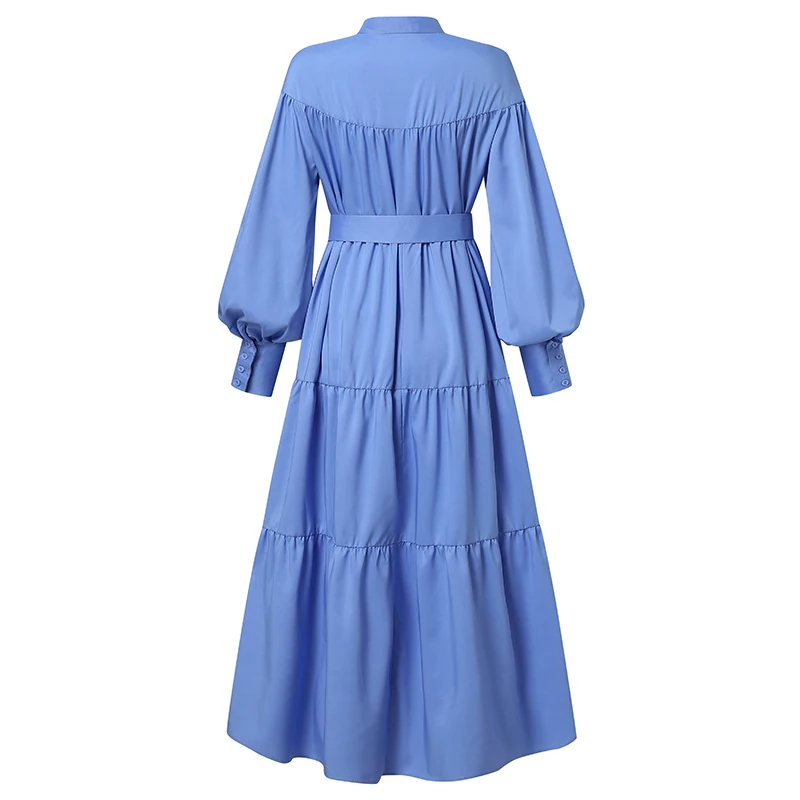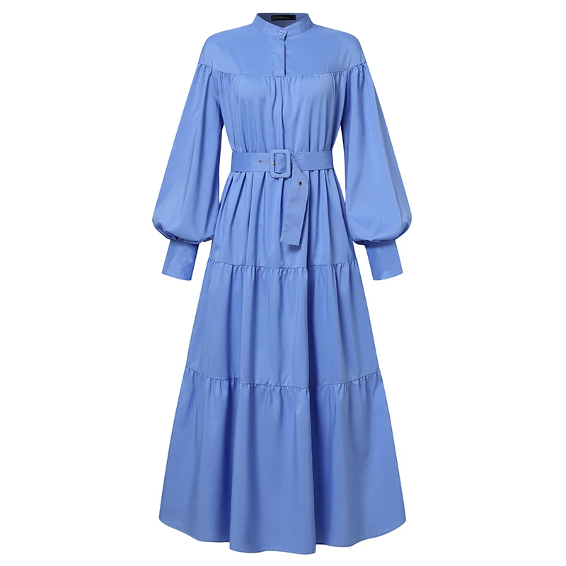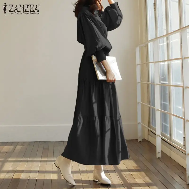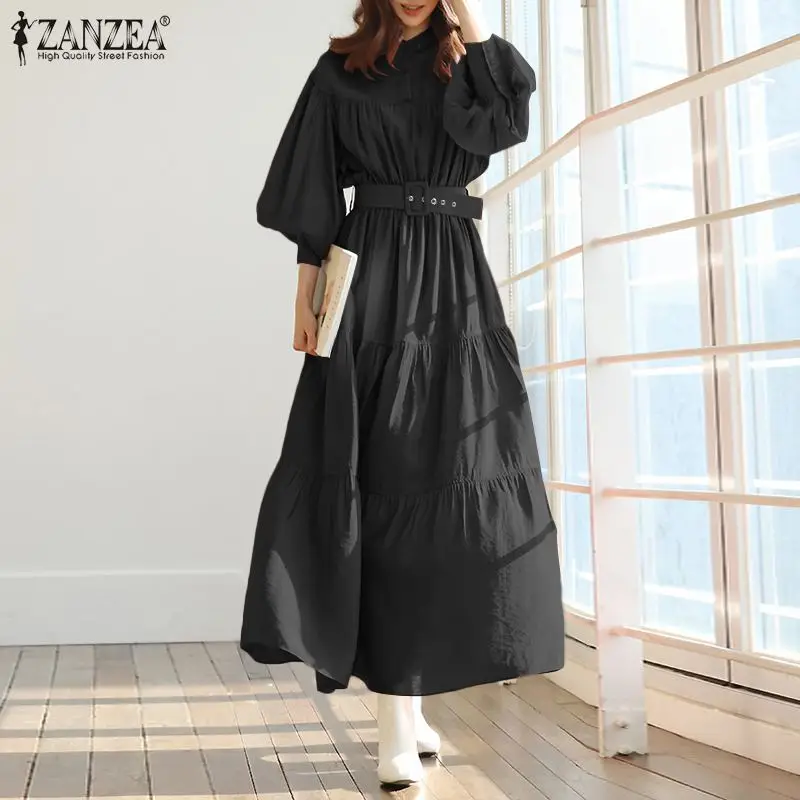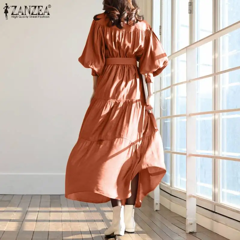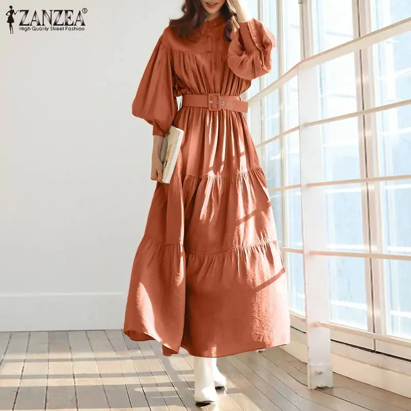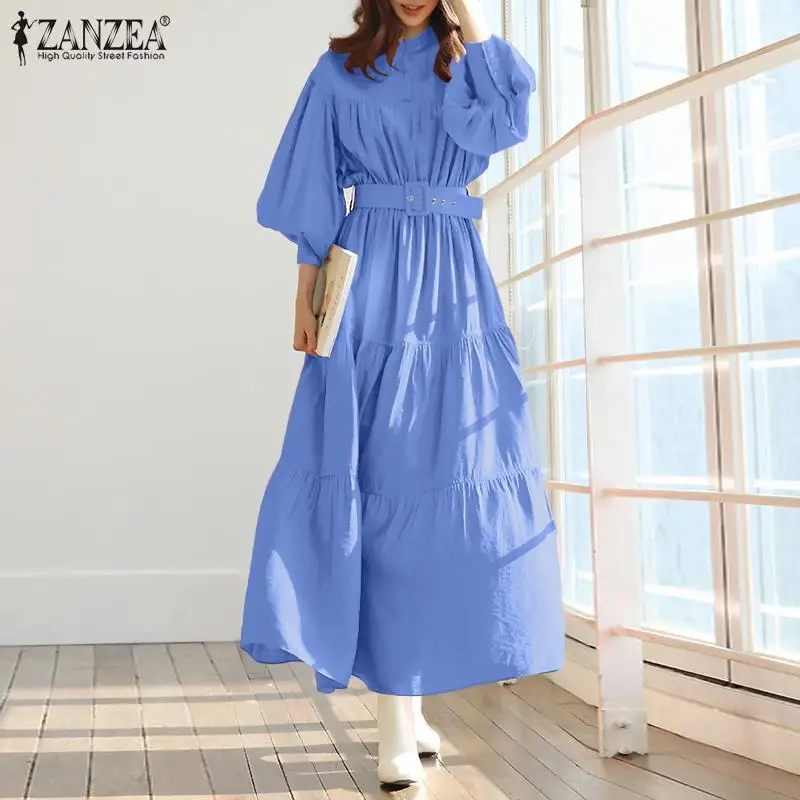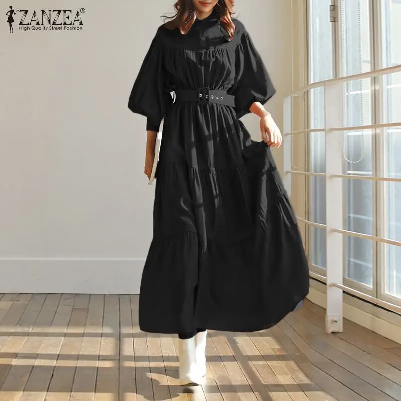Женское Элегантное Длинное Платье макси с пышными рукавами 2021 ZANZEA, весенний сарафан с поясом, повседневный офисный однотонный длинный халат