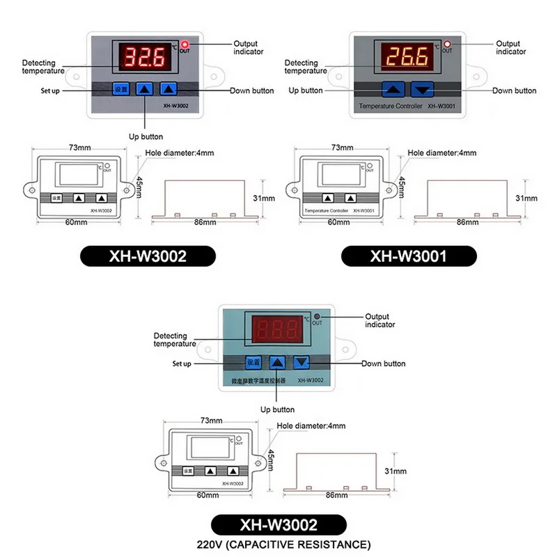 Диапазон измерения температуры: -50 ℃-110 ℃Диапазон контроля температуры: -50 ℃-110 ℃Точность измерения: +/-0,2 градусов ЦельсияТочность управления: 0,1 ℃Водонепроницаемый зонд: 1 мПитание: 12/24/110-220 ВТок: 120/240/1500 ВтВыход: макс.10aШаг установки: 73 мм (диафрагма 4 мм)Размер: 60*45*31 мм/160*55*42 ммЦвет: разноцветныйМатериал: корпус ABS, электронные компоненты