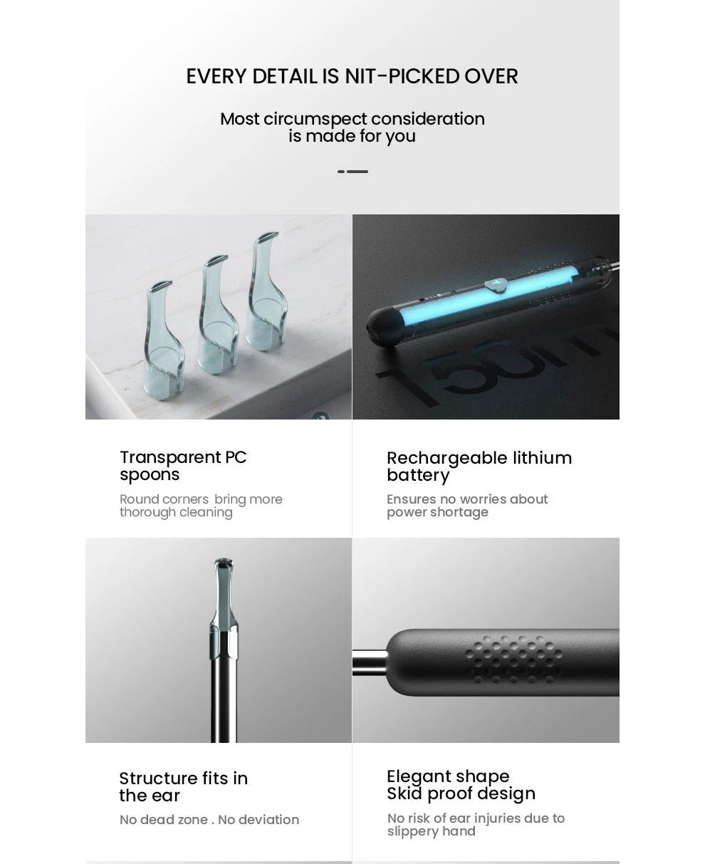 1. Визуальная очистка показывает слуховое meatus кристально чистое; 2. Позволяет чистить уши; 3. Трехмегапиксельный Высокоточный эндоскоп обеспечивает новый уровень визуализации; 4. Наконечники ушной ложки из поликарбоната, хорошо сидят в ушах; 5. Литиевые батареи можно заряжать повторно.