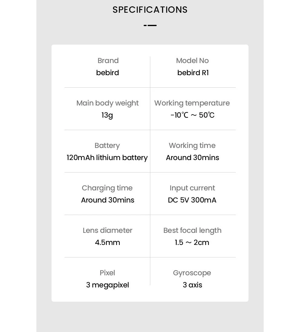 Бренд: BEBIRD Модель: bebird R1 Вес: 13 г Рабочая температура: -10 ~ 50 Батарея: литиевая батарея 120 мАч Время работы: около 30 минут Время зарядки: около 30 минут Входной ток: 5 В постоянного тока 300 мАч Объектив Диаметр: 4,5 мм Лучшее фокусное Длина: 1,5 ~ 2 см Пиксель: 3 мегапикселя Гироскоп: 3 оси