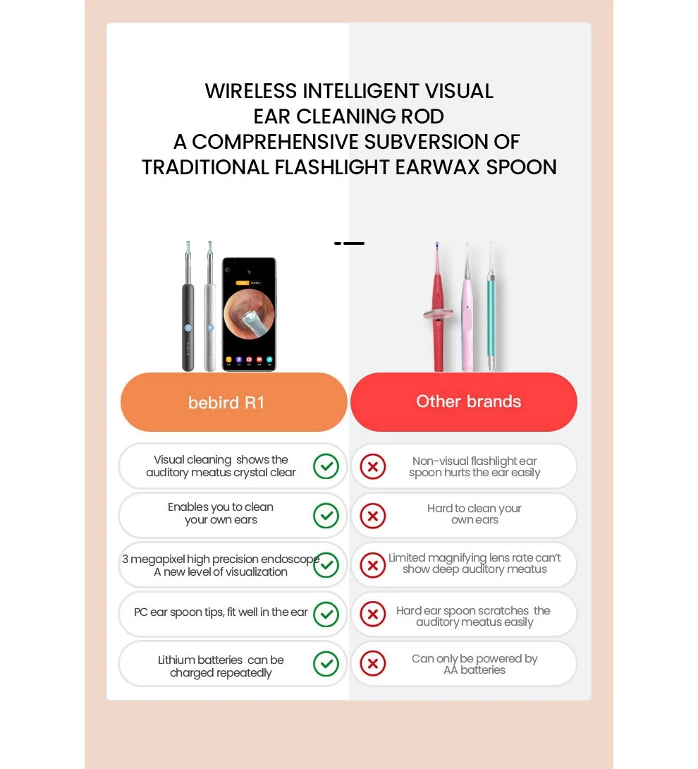 Здоровье ушей важно для нашей жизни. Каждый должен иметь пару здоровых ушей, чтобы услышать красоту мира. Если у вас нет очищенных ушей, ушной воск может быть легко сложен, чтобы накапливать микробы в ушах, это заканчивается инфекцией, чтобы повредить ваш слуховой аппарат, ношение слухового аппарата может быть конечным результатом. BEBIRD R1 визуальный ушной чистящий стержень помогает вам проверить слуховой канал на смартфоне и удалить ушной воск в то же время.
