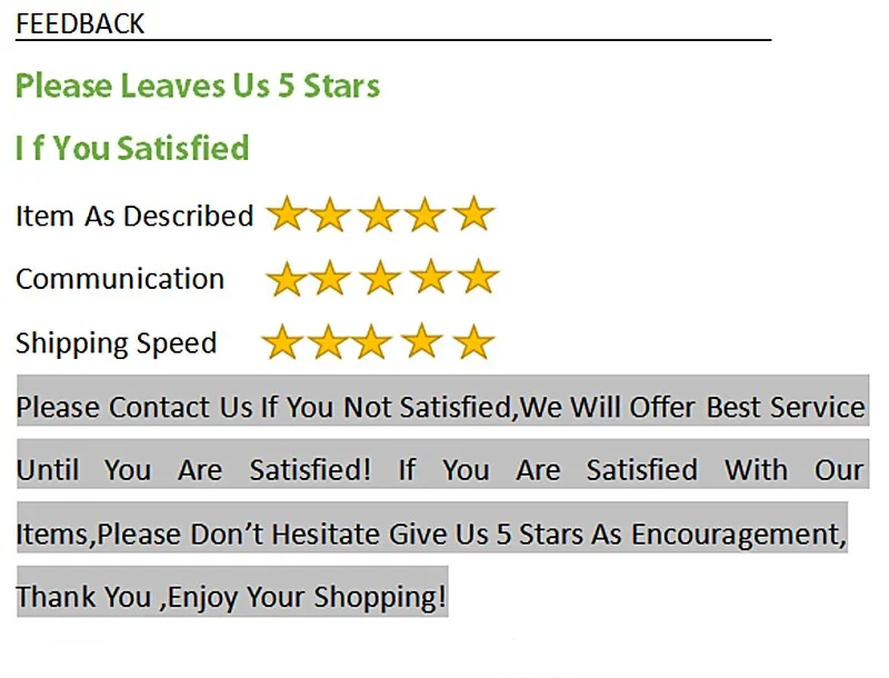 3. Ваше удовлетворение и положительные отзывы очень важны для нас. Если вы удовлетворены нашими товарами и услугами, пожалуйста, оставьте положительотзывы в с оценкой 5 звезд.