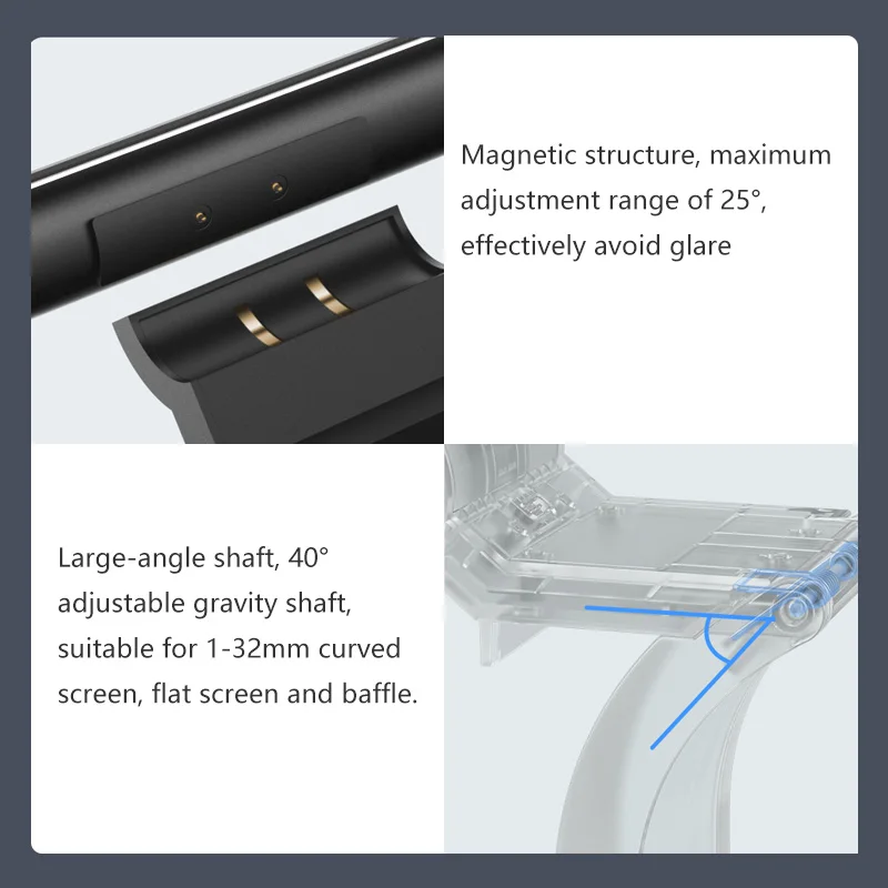 Магнитная структура, максимальный диапазон регулировки 25 °, эффективно предотвращает блики. Большой угол, регулируемый гравитационный вал 40 °, подходит для изогнутого экрана толщиной 1-32 мм, плоского экрана и перегородки. Металлический корпус лампы, с металлическим корпусом, прохладный черный и стильный.