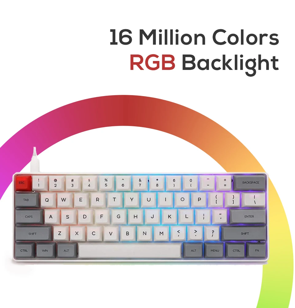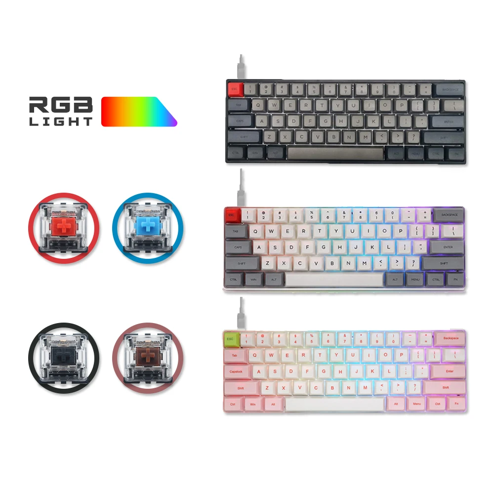 6,SK61-это стандартная клавиатура 60% с RGB подсветкой, USB-C проводным подключением и оптическими переключателями. Кабель USB-C отстегивается для удобства переноски.