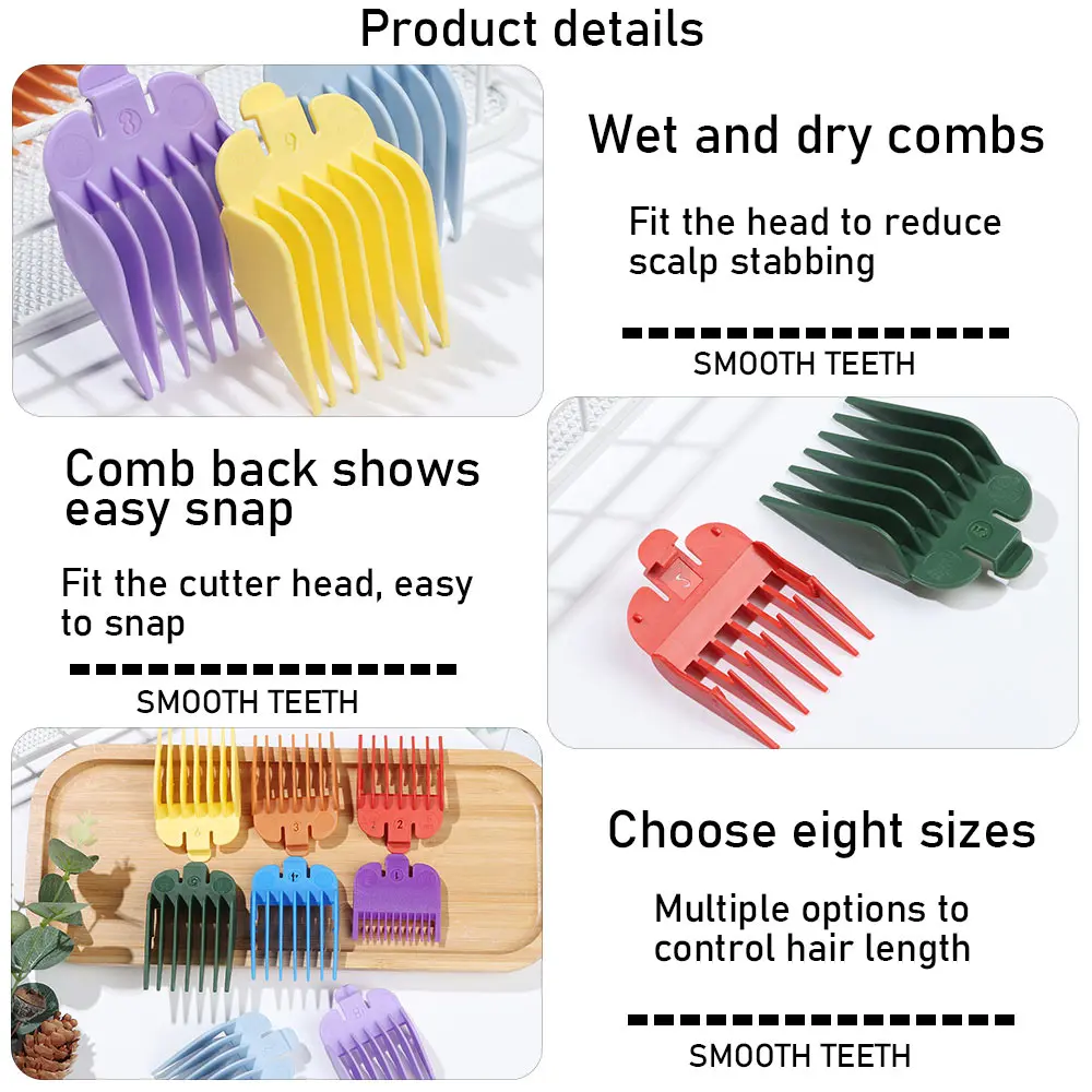 Отлично подходит для стильных зубцов-расчесок направляющих для стрижки имеют круглую форму, не нужно беспокоиться о ударе кожи головы. Гребни для стрижки имеют 8 различных длин резки с высокой строгой, вы можете закрепить различную длину ваших волос и создать свою прическу на основе ваших собственных предпочтений.