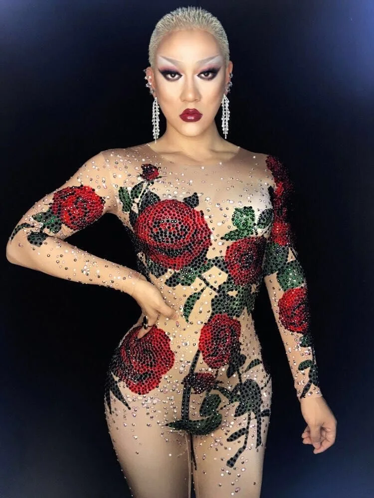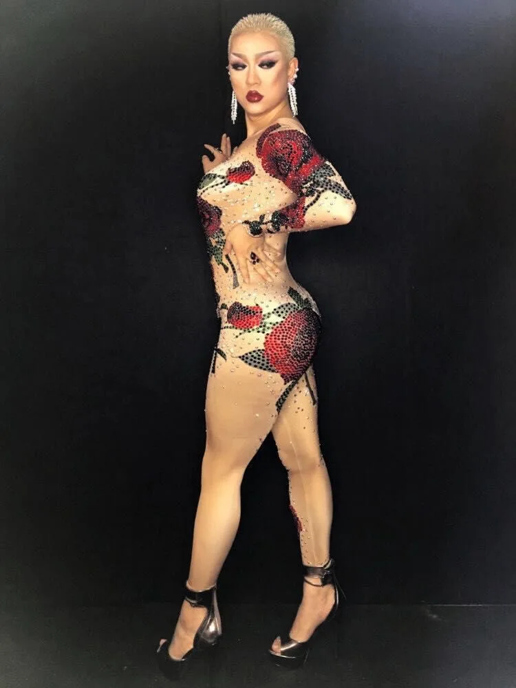 Женский сценический комбинезон, боди со стразами и розами, для танцев, певиц