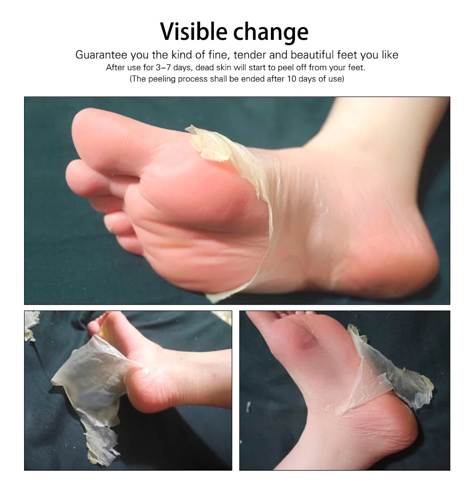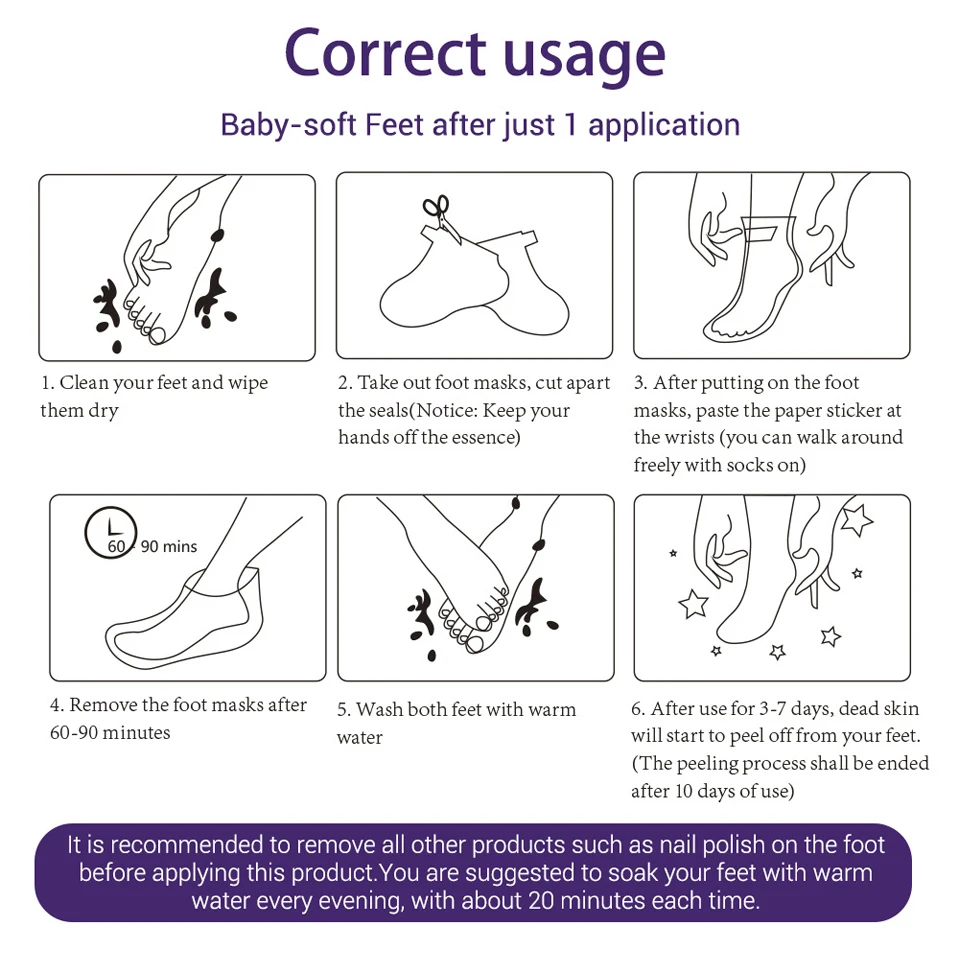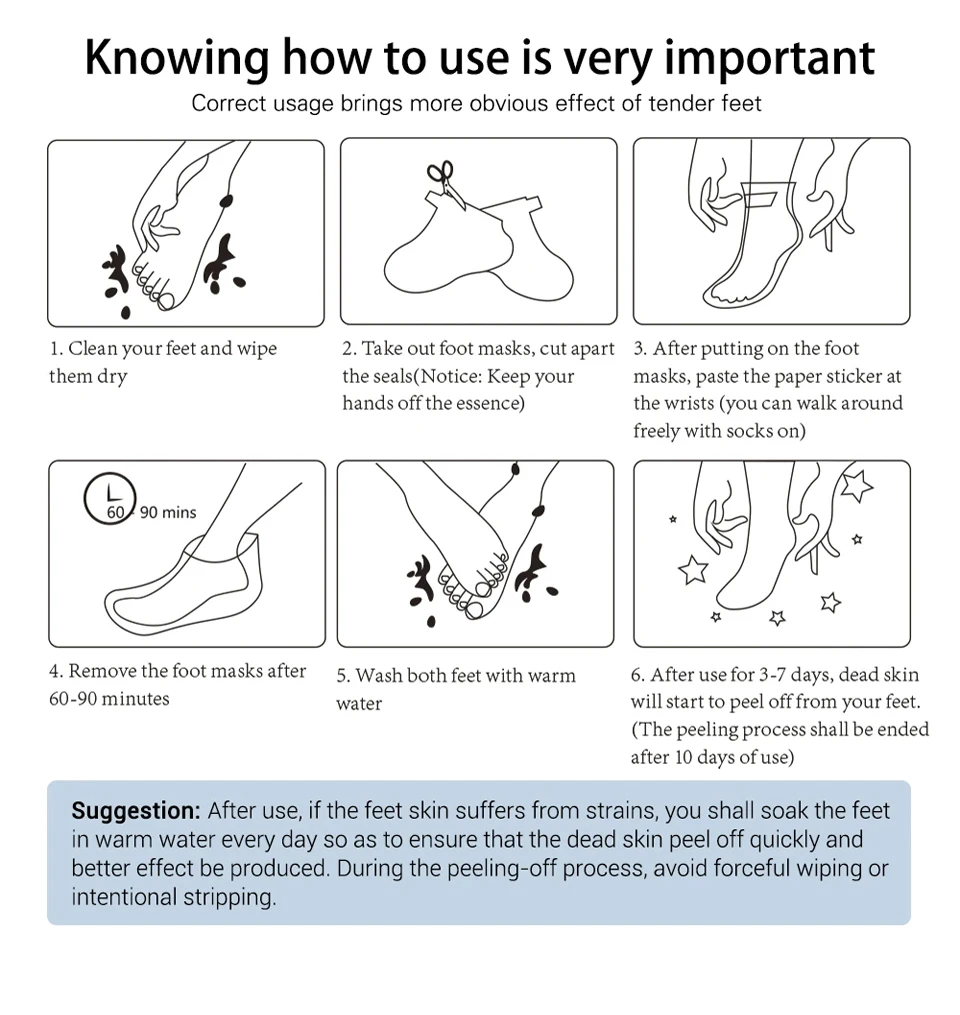 1. Перед использованием промойте ноги чистой водой (рекомендуется использовать горячую воду при температуре около 40 градусов) и протрите их чистой.2. Используйте ножницы, чтобы разрезать герметичный упаковочный пакет для ножной мембраны.3. После надевания маски на стопу рекомендуется носить пару длинных носков снаружи для полного контакта между эссенцией и кожей.4. Снимите маску для ног через 60 минут, а затем Вымойте ноги.5. Большинство людей начнут заменять омертвевшую кожу после 48 часов использования, но из-за различных типов кожи некоторым людям может потребоваться использовать 2-3 пары, пожалуйста, используйте маску для ног снова через 48 часов.6. Мы рекомендуем замочить ноги в горячей воде через 48 часов.