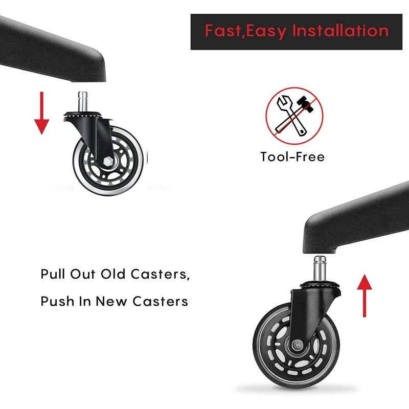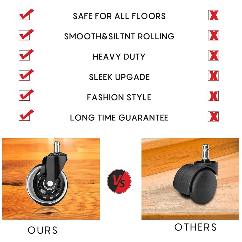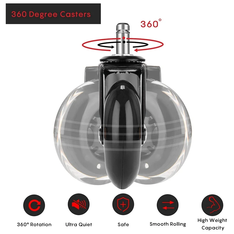 [Безопасно для всех полов] не повредит любые виды пола. Колесико покрыто высококачественным мягким полиуретановым материалом, гарантированно защитит ваши полы от царапин и следов на поверхности.[Идеальное качество] весь опорный кронштейн и внутренние детали изготовлены из высококачественной стали, которая может безопасно поддерживать до 400 фунтов в наборе из 5, обеспечивает долгую плавную прокатку и долговечность, легко изменить направление, как вы хотите, и металлическая рама никогда не сгибается, как другие. Идеально подходит для дома, офиса и т. д.[Плавная прокатка без шума] прецизионные шариковые подшипники в Поворотном ролике и axel обеспечивают плавную, легкую прокатку, не вызывая при этом скрипучие звуки или шум любого типа, поможет вам чувствовать себя расслабленным и комфортным, чтобы наслаждаться тихой жизнью.[Универсальная совместимость] предназначена для универсального стандартного размера полюса: 11x22 мм, вы можете вставить сменный ролик в ваш компьютерный стул или настольную мебель. Очень легко установить. Просто используйте гаечный ключ, чтобы вытащить старый Кастер и вставить новый Кастер. Совершенно новый внешний вид, стильный стиль офисного кресла.[Устойчивость к царапинам]: мягкая поверхность прокатки обеспечивает стабильную работу, не беспокоясь о повреждении бамбука, лиственных пород, ламината, плитки, полированного бетона, ковров и т. д.Цвет: черныйМатериал: металлПосылка:5 x колесико для офисного креслаТолько вышеуказанная посылка, другие товары не включены.Примечание: светильник и различные дисплеи могут привести к тому, что цвет товара на картинке немного отличается от реального. Допускается погрешность в измерениях +/- 1-3 см.