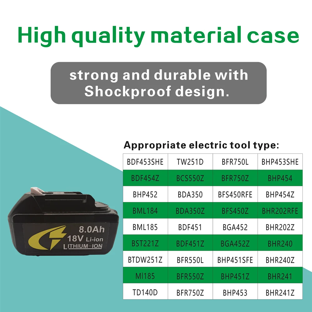 Модель: аккумуляторная запасная батарея BL1860B для электроинструментов MakitaНоминальное напряжение: 18 вНоминальная емкость: 10000 мАчТип батареи: литий-ионныйОсобенности:1. Последняя обновленная печатная плата с функцией обнаружения баланса одной ячейки, может сделать каждый элемент заряжен и разряжен баланс, эффективно предотвратить каждый элемент перезарядки и переразряда2. Встроенный чип памяти и ЦП, может автоматически установить эффект зарядки аккумулятора, защитить батарею3. Защита от неправильного напряжения, короткого замыкания, внутреннего перегрева.4. Высококачественный материал чехол, прочный и прочный с противоударным дизайном.5. Светодиодный индикатор, может знать оставшуюся мощность в любое время.Сменные коды батарей:194204-5 194205-3 194309-1 194230-4 BL1815 BL1830 BL1840 BL1850 BL1860 LXT400Подходящие модели электроинструментов:BDF453SHE,BDF454Z,BHP452, BML184, BML185, BST221Z,BTDW251Z,ML185,TD140D, TW251D, BCS550Z,BDA350 BDA350Z, BDF451, BDF451Z,BFR550L, BFR550Z,BFR750, BFR750L, BFR750Z,BFS450RFE, BFS450Z,BGA452, BGA452Z BHP451SFE, BHP451Z,BHP453, BHP453SHE,BHP454,BHP454Z, BHR202RFE, BHR202Z, BHR240, BHR240Z, BHR241, BHR241Z