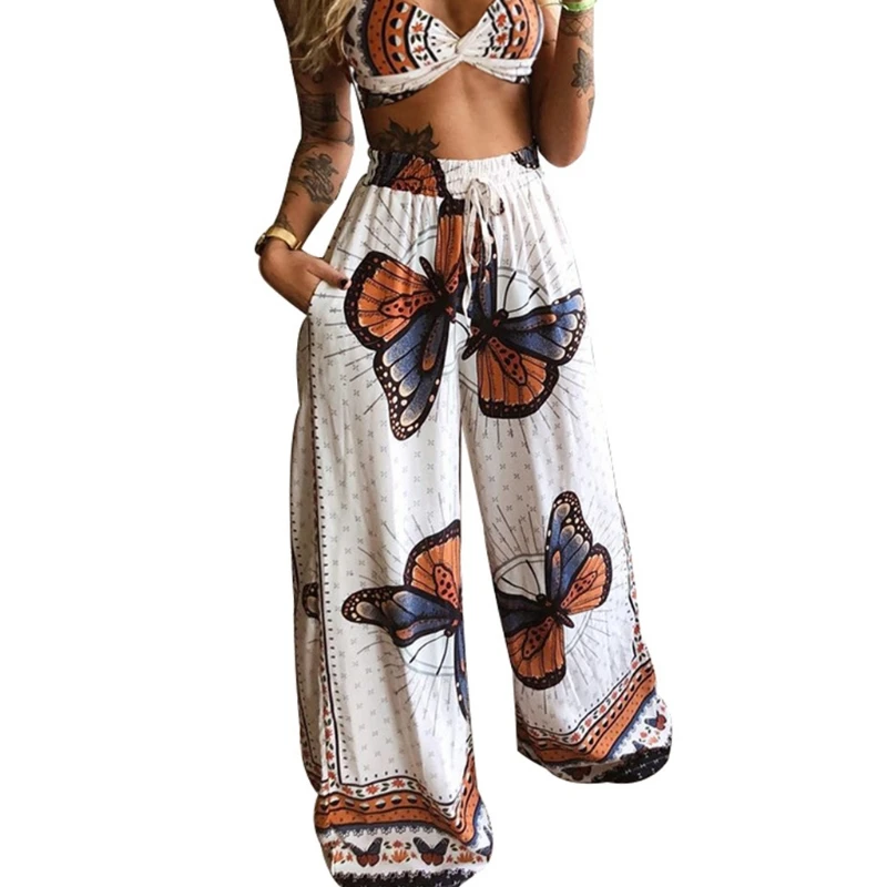Женский Летний Пляжный комплект из 2 предметов, привлекательный укороченный топ с V-образным вырезом и широкие брюки-палаццо, богемная одежда для отдыха с принтом бабочки