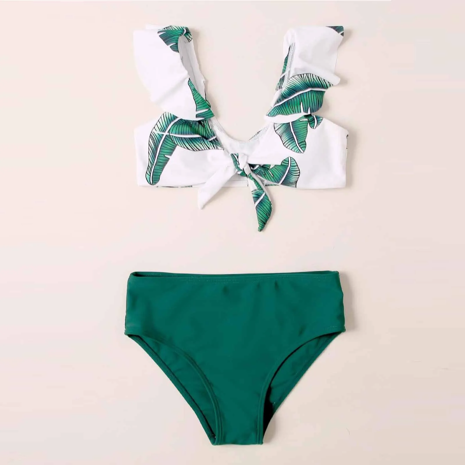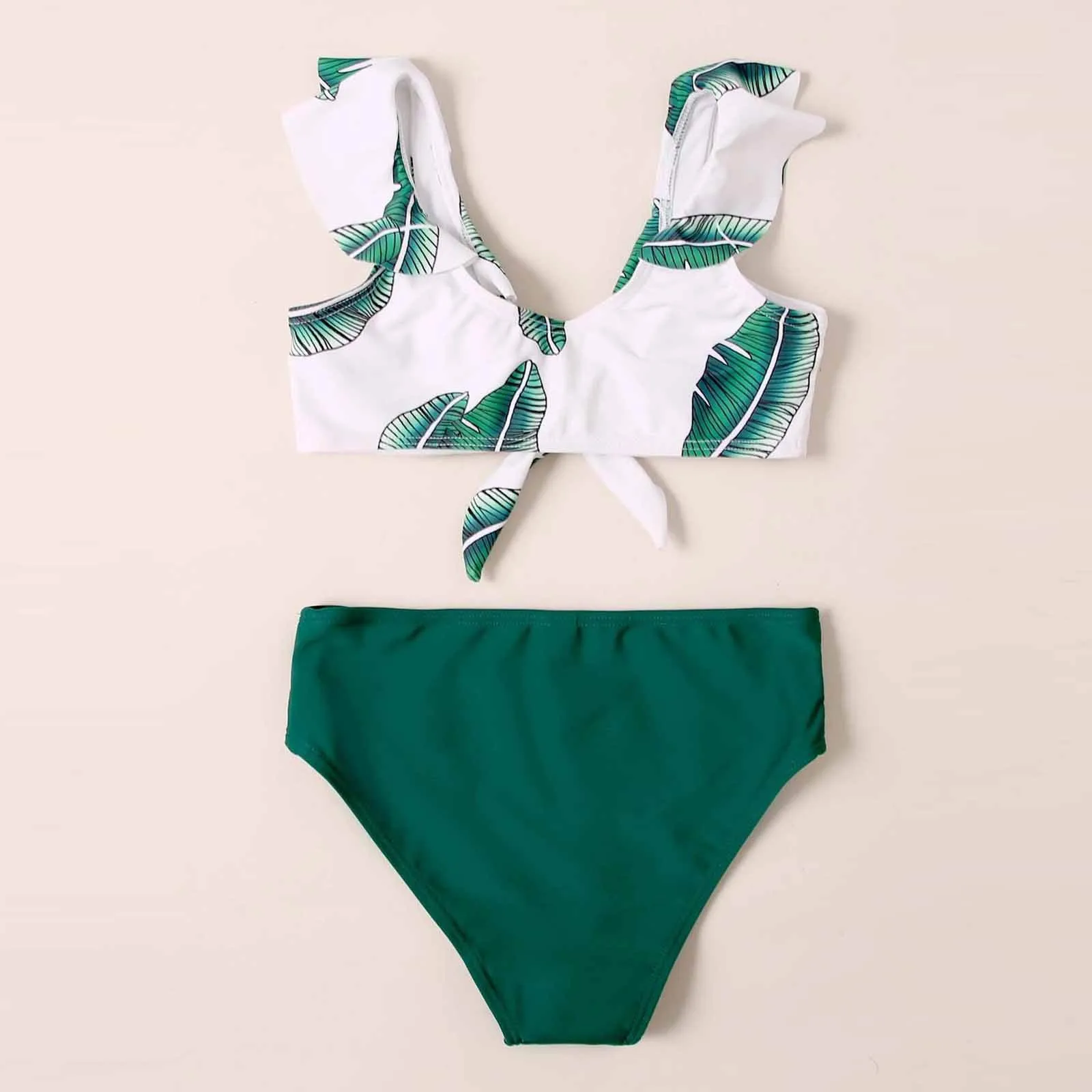 Купальник для девочек с принтом зеленых листьев и растений, летний детский купальник с оборками и бантом, купальный костюм, пляжная одежда