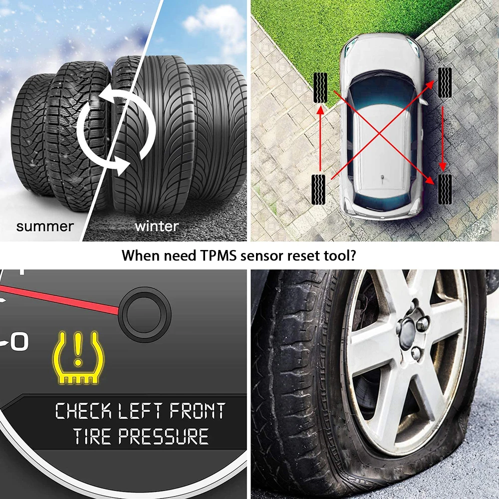 • Новые датчики TPMS установлены, пропускают воздух или добавляют воздух в шину, не могут сделать систему распознавать новые датчики.• Низкое давление в шинах или утечка/замена или установка оборудования для мониторинга давления в шинах/замена шин, повреждение датчика и т. д. после решения этих проблем необходимо сбросить TPMS.• Обмен зимних шин или летних шин. TPMS необходимо сбросить.• Низкое давление в шинах или утечка/замена или установка оборудования для мониторинга давления в шинах/замена шин, повреждение датчика и т. д. после решения этих проблем необходимо сбросить TPMS.