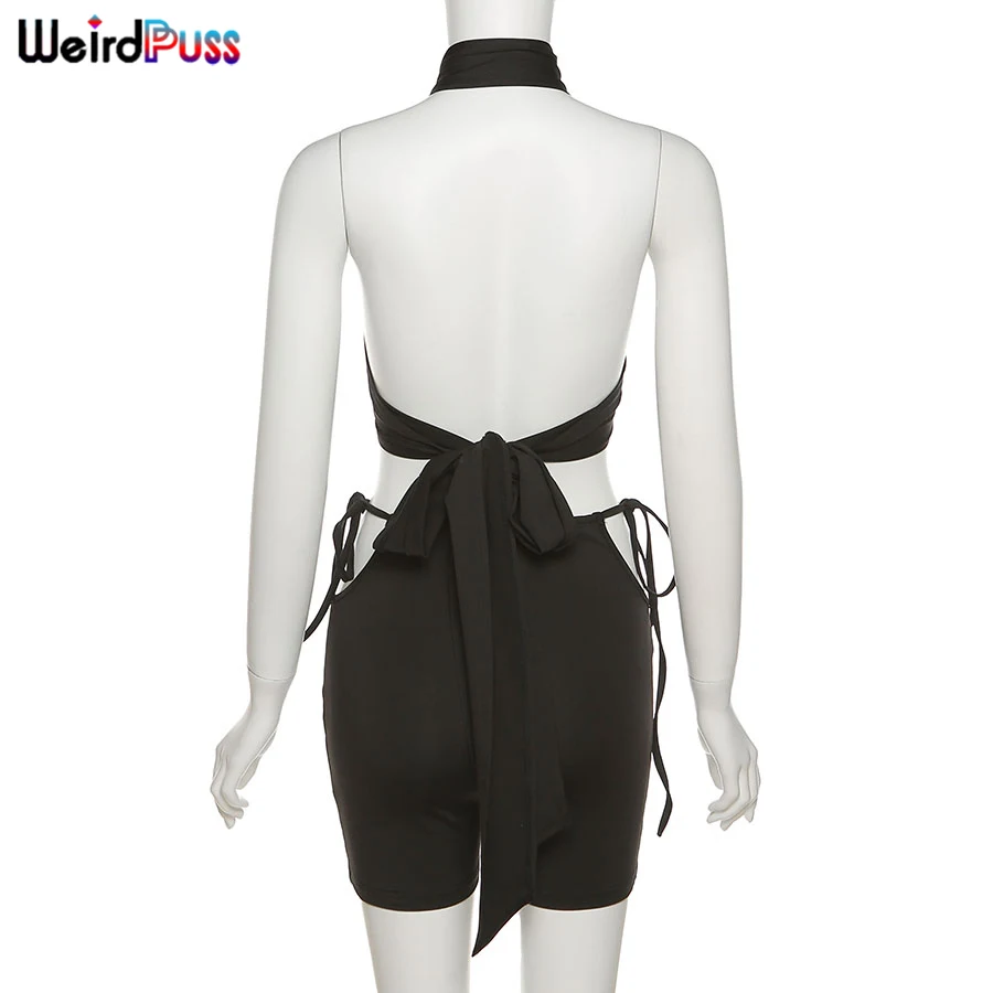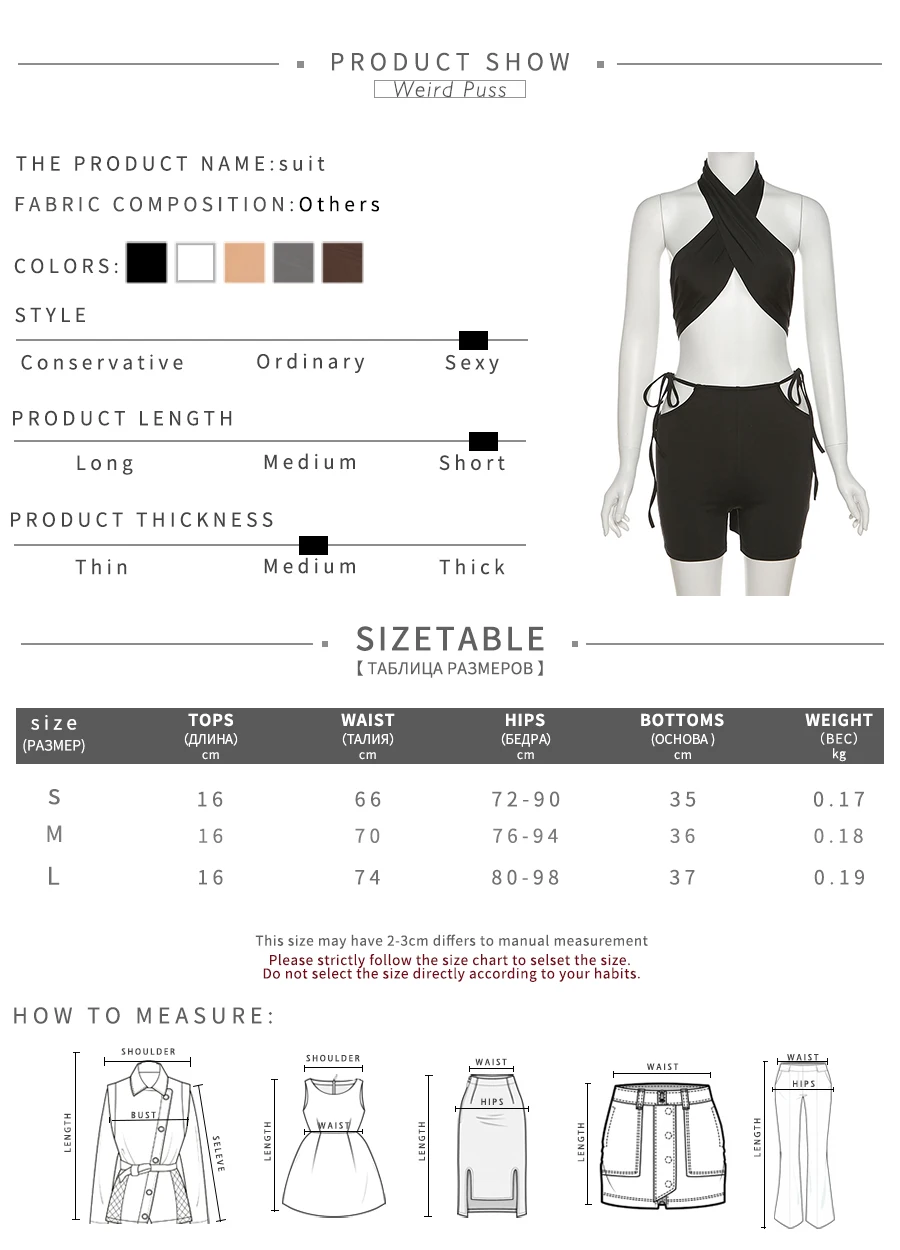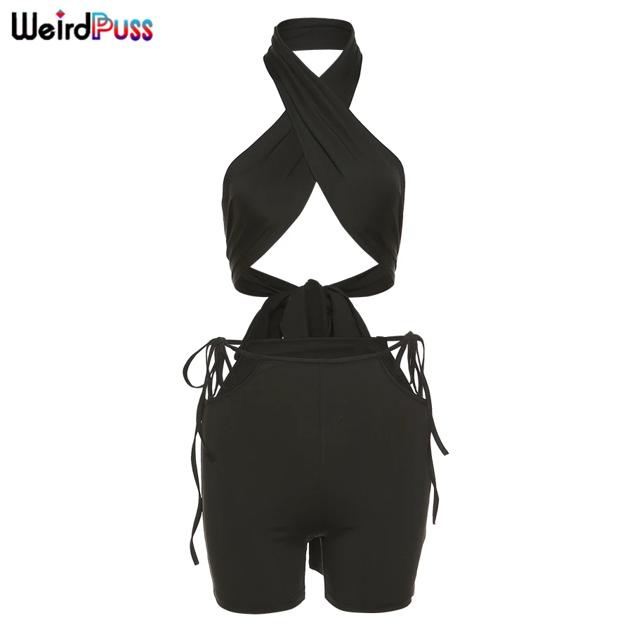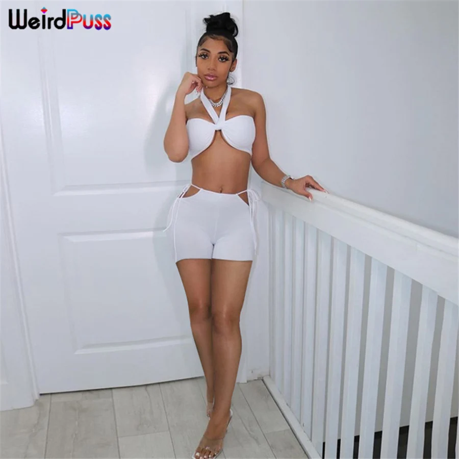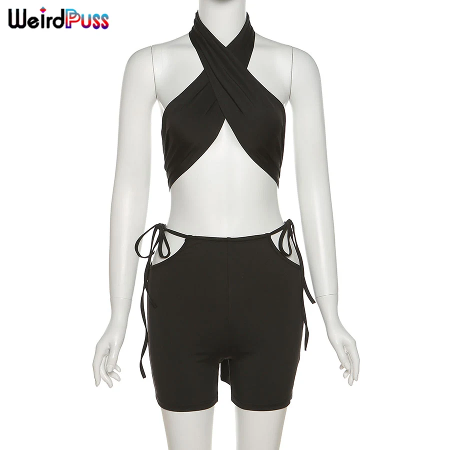 Костюм спортивный женский летний из 2 предметов: топ на бретельках с перекрестными лямками через шею и велосипедные шорты с вырезами