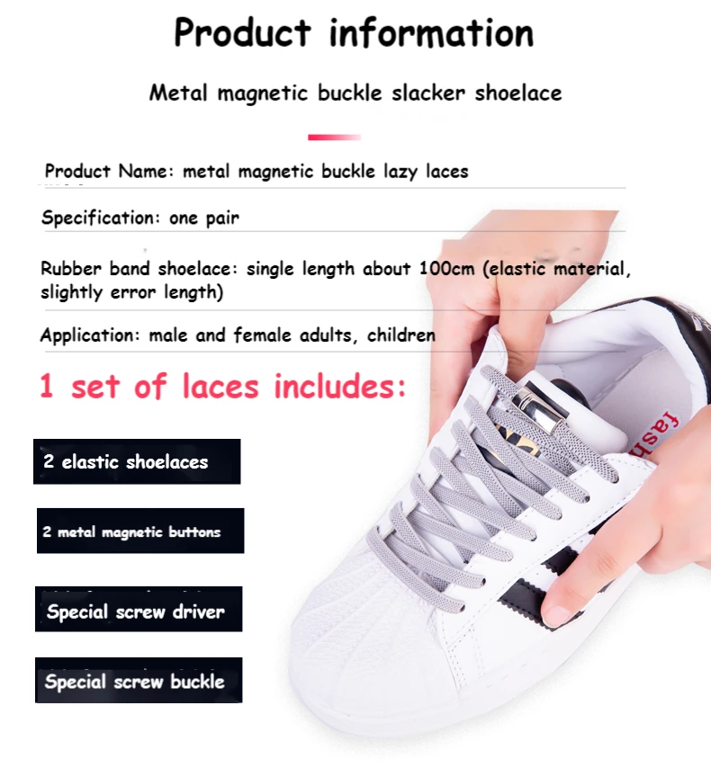 Научный дизайн: обновленная версия, шнурки без галстука имеют уникальную изогнутую магнитную пряжку и плоская эластичная веревка. Конструкция с двойным замком на магнитной застежке позволяет вам никогда не беспокоиться о том, что шнурки будут ослаблены; кружевные замки изогнуты и оснащены плоским тянущимся шнуром, который идеально сочетается с ногами, чтобы ваши ноги были удобны в течение всего дня. Экономия времени/простота использования: без галстука, никогда не беспокойтесь о том, чтобы завязывать обувь снова во время любой деятельности. Прост в использовании. Надевать обувь будет непросто. Эти эластичные шнурки для обуви легко и быстро снимаются. Идеально подходит для всех: эластичные шнурки без галстука-отличный подарок для пожилых людей, страдающих артритом или другими ограниченными возможностями, детей-аутистов, бегунов, стремящихся ускорить переход к триатлону, и необходимо для любителей спорта. Простая установка: один размер подходит всем (детям и взрослым), быстро устанавливается, прост в использовании. Каждая пара подходит для шнуровки 1 пары обуви. Простые инструкции по установке. 100% гарантия соответствия: до тех пор, пока вы являетесь нашими клиентами, с того дня, когда вы покупаете шнурки. Мы предоставим вам 24-часовой непрерывный сервис. Мы искренне верим, что мы предоставим клиентам наиболее удовлетворенный опыт покупки.