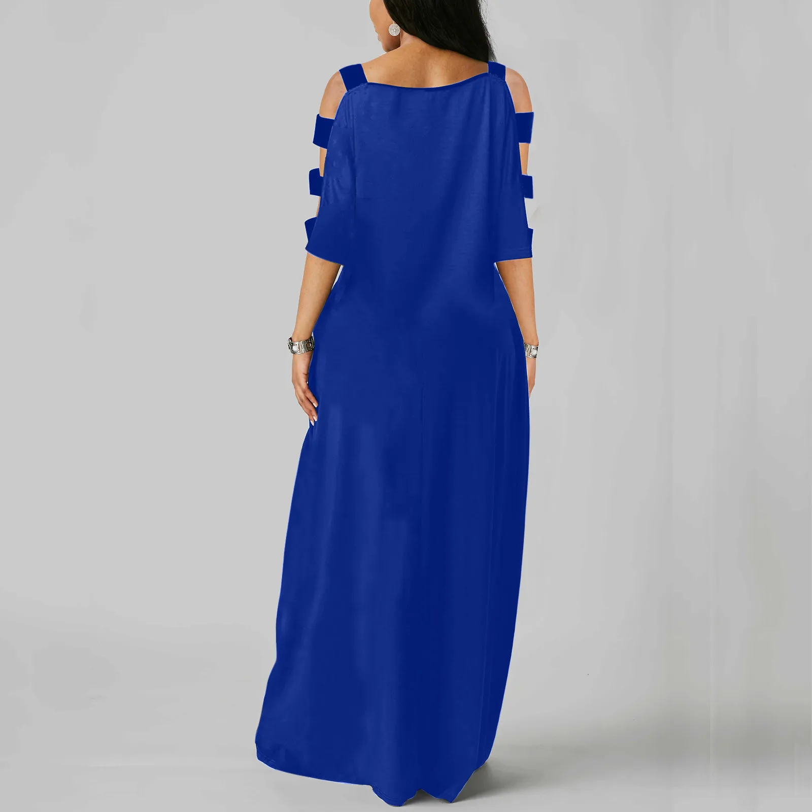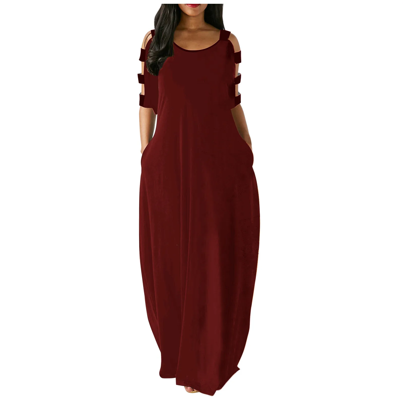 Женское однотонное платье макси, с круглым вырезом и боковыми карманами, с вырезом по лестнице, большие размеры, сексуальное длинное платье в стиле бохо, свободная повседневная одежда