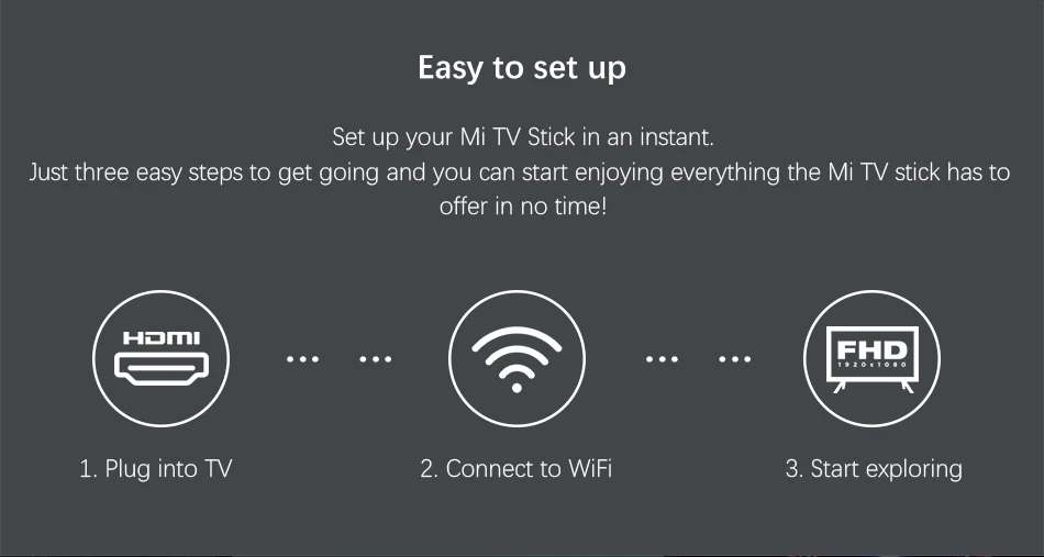 Настройте свой Mi TV Stick в одно мгновение. Три простых шага, чтобы идти, и вы можете начать наслаждаться всем, что Mi TV stick может предложить в кратчайшие сроки!