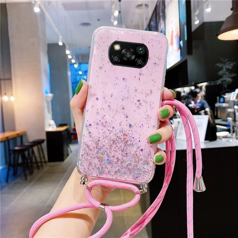 Чехол с ремешком через плечо для POCO F3 X3 nfc M3, мягкий прозрачный блестящий силиконовый чехол для Xiaomi Redmi K40 Pro Note 9 Pro Max 8 7