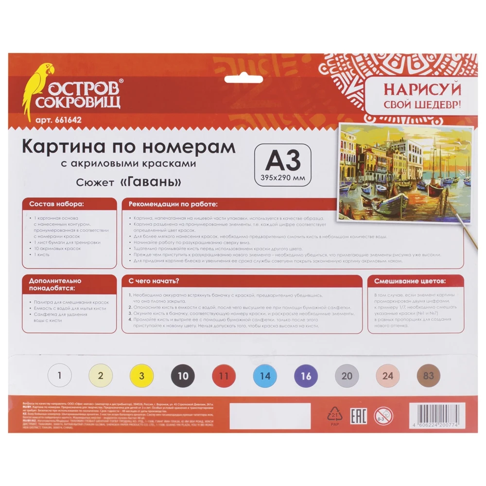 Картина по номерам ОСТРОВ СОКРОВИЩ – это отличный способ почувствовать себя художником и интересно провести время всей семьей. Работа над картиной развивает внимательность, усидчивость, аккуратность.В набор входит: 1 картонная основа с контуром, 1 лист бумаги для тренировки, 10 акриловых красок объемом 3 мл каждая и синтетическая кисть. Формат основы - А3 (395х290 см). Дополнительно понадобятся: палитра для смешивания красок, емкость с водой для мытья кисти, салфетка для удаления воды с кисти (В КОМПЛЕКТ НЕ ВХОДЯТ). Подходит для потребителей всех возрастов от 8 до 80 лет. Поставляется в картонной упаковке с европодвесом.Наполните жизнь вдохновением! Закажите картину по номерам ОСТРОВ СОКРОВИЩ "Гавань" уже сегодня!• Вид творчества: рисование (роспись).• Количество предметов в наборе: 13.• Комплектация: акриловые краски, картон с нанесенным контуром, кисть, лист бумаги для тренировки.• Возрастная группа: 8-80 лет.• Пол: универсальный.• Материал: картон.• Длина готового изделия: 39.5 см.• Ширина готового изделия: 29 см.• Упаковка: картонная с европодвесом.• Артикул производителя: 661642.