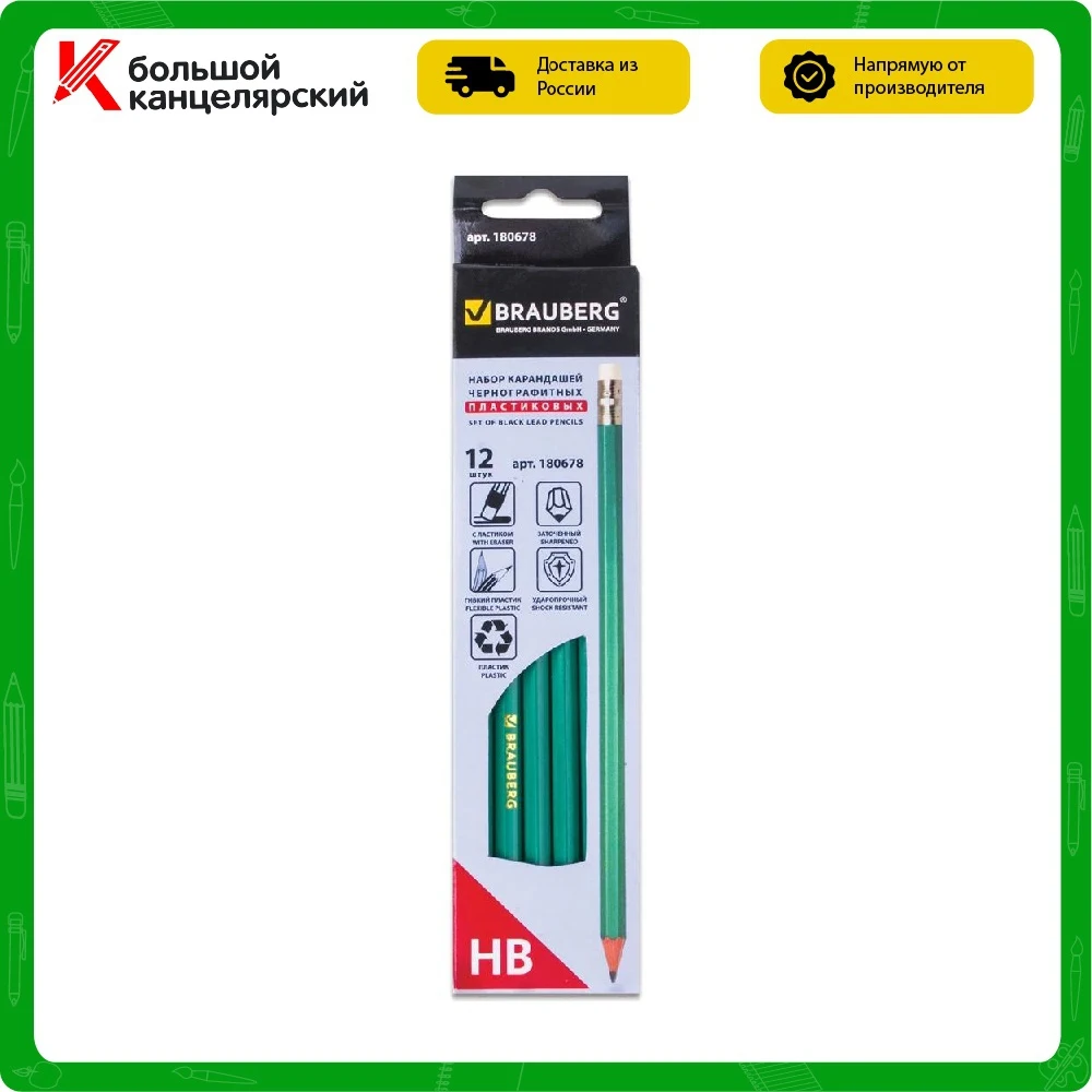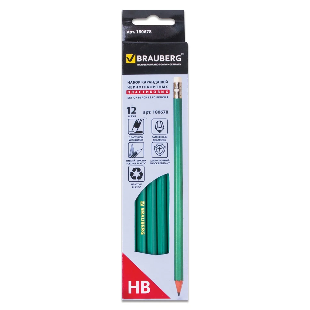 Изготовлены из высококачественного пластика, оснащены ластиком. Имеют шестигранное сечение. Карандаши длиной 190 мм легко точатся и не крошатся. Обладают средней степенью твердости – HB. Выполнены в зеленом цвете. Поставляются заточенными.Покупайте набор чернографитных карандашей BRAUBERG по выгодной цене в нашем интернет-магазине!
