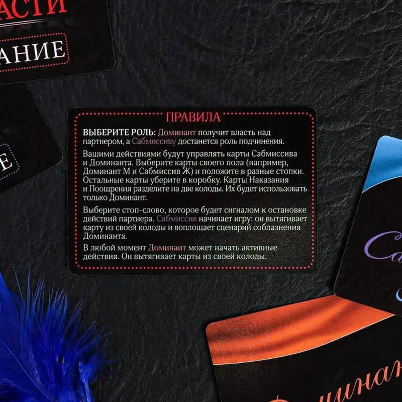 Выберите, кто будет исполнять роль Сабмиссива, а кто - Доминанта, и воплощайте свои самые сокровенные фантазии с помощью карт выбранных ролей!