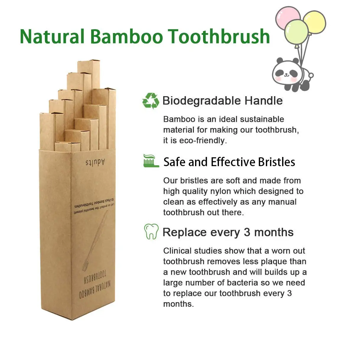 Почему переключается на бамбуковую зубную щетку?Больше, чем заполнение насадок, убивание животных и добавление к гигантским плавающим в середине океана мусорным заплаткам размером с страны, пластиковые щетки также требуют, по крайней мере, более тысячи лет, чтобы разложиться-вот почему бамбук так велик. Бамбук-это быстрорастущая экологически устойчивая древесина, которая регенерируется естественным образом с минимальным количеством дождя и без необходимости использования вредных пестицидов.Энергия, которая идет на изготовление бамбуковой зубной щетки-это всего лишь небольшая часть того, что требуется для производства пластиковой альтернативы.Биоразлагаемые ручкиНаши ручки для зубных щеток изготовлены из натуральных, органических, 100% биоразлагаемых бамбуковых ручек.Экстра мягкие щетинки без бисфенолаНаши щетинки изготовлены из мягкой, игловидной и без бисфенола нейлоновой щетины, которые могут обеспечить максимальную производительность для удаления пятен, зубного камня и зубного камня для ваших белых зубов и чувствительных десен. Ваши зубы всегда будут здоровыми!Рециркулирует пакетНаша упаковка без пластика и вторичной упаковки, которая сделана из крафт-бумаги.Каждая большая коробка содержит 5 маленьких коробочек, каждая маленькая коробка содержит 2 пронумерованные зубные щетки.Технические характеристикиДлина ручки: 7,5 дюймаДлина головки щетки: 1 дюймДлина щетины: 0,4 дюймаПростое изменение для вас, большое изменение для Земли.Нажмите кнопку «Добавить в корзину» прямо сейчас!
