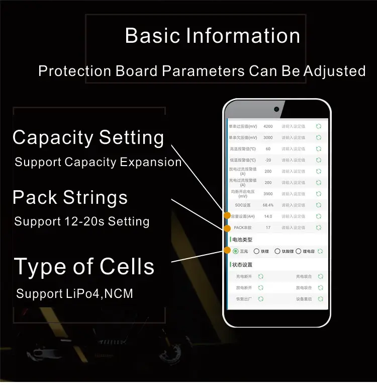 -Поддержка расширения Bluetooth-алгоритм SOC электричества, более точный, чем метод напряжения-Поддержка настройки параметров BMS (поддержка расширения емкости, поддержка любого количества 12-20 струн, поддержка ternary, литий-железо, титанит лития, супер конденсатор)-Поддержка RS485/CAN связи-поддержка протокола настройки