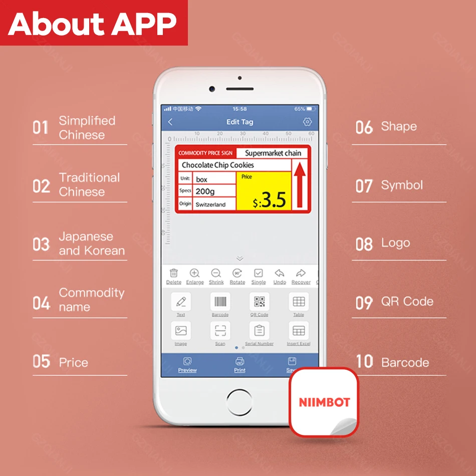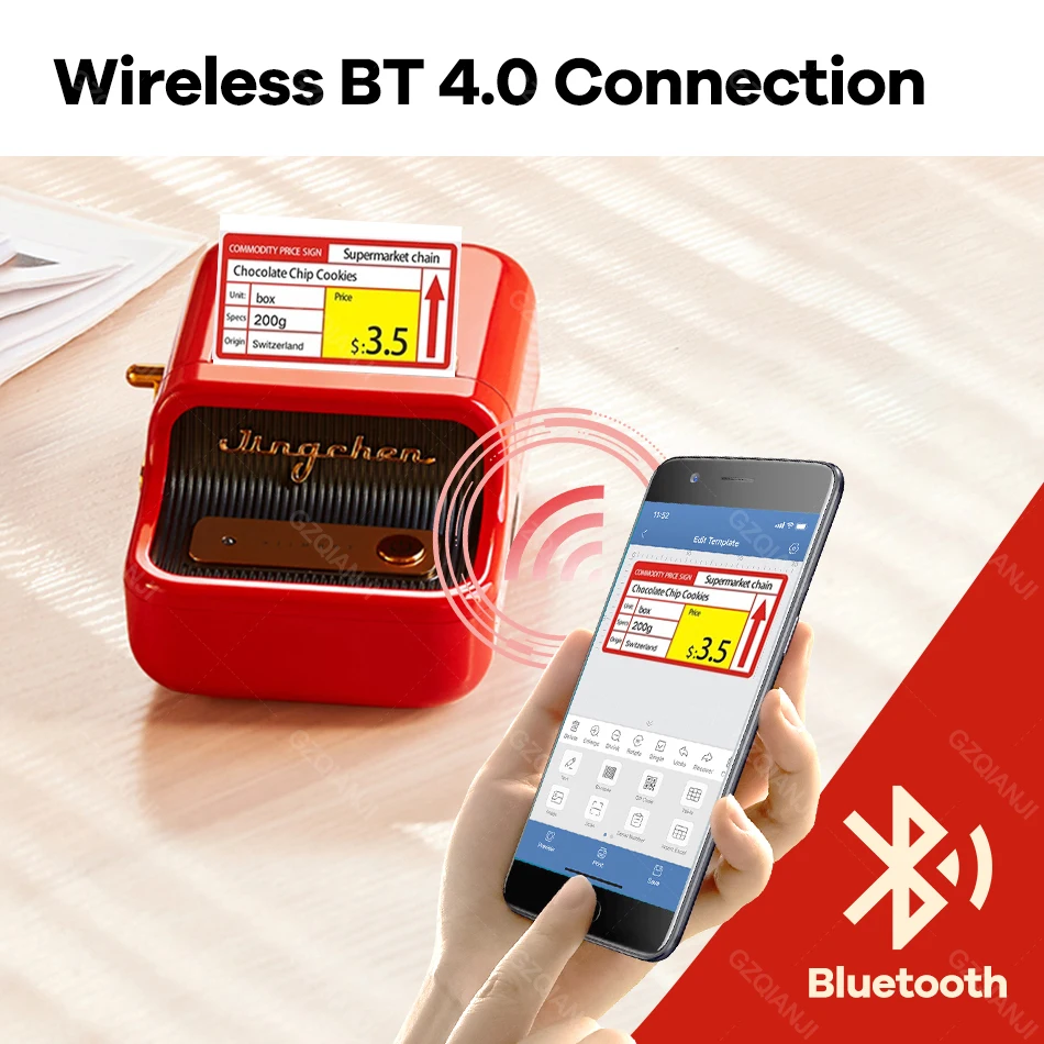 Беспроводной дизайн, поддерживает печать на большие расстоянияПрямой тепловой, без чернил, тонера или лент.Поддерживает все основные форматы этикеток: цена, дата, размер, вес, имя и т. д.Универсальный, простой в использовании.Компактный и легкий, удобный для переноски.Аккумулятор емкостью 1200 мАч поддерживает длительное использование.Характеристики:
