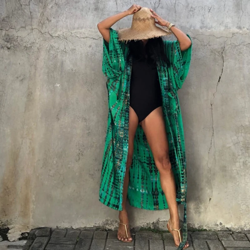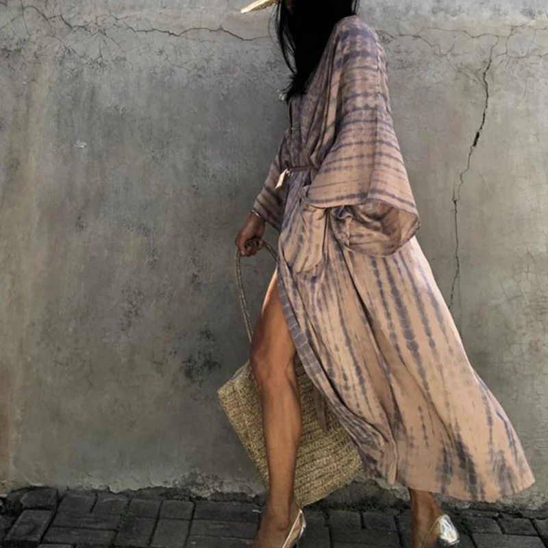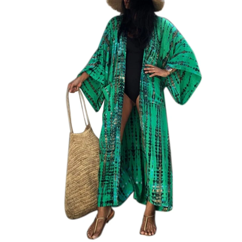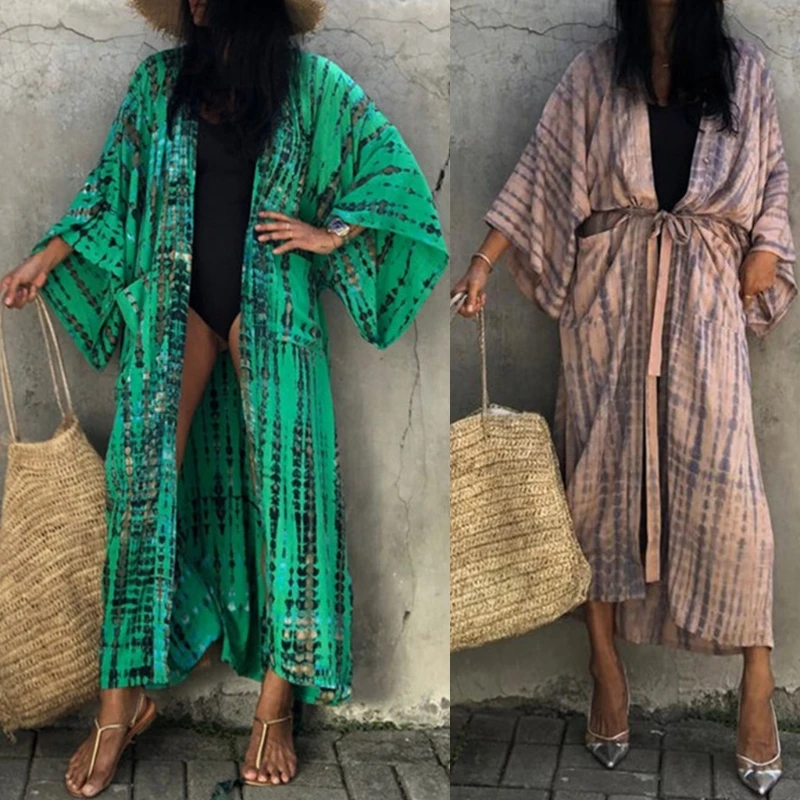 Женское кимоно в полоску, с принтом тай-дай, летний солнцезащитный Кардиган с длинным рукавом, пляжное макси-платье с поясом, открытый перед, бикини, купальник M6CD