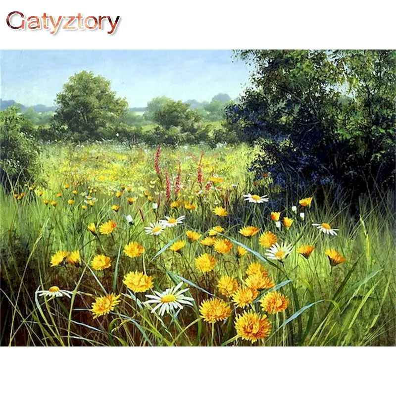 GATYZTORY Луг желтый цветок DIY картина по номерам для путешествий для взрослых пейзаж современного искусства стены декора ручная роспись Diy подарок