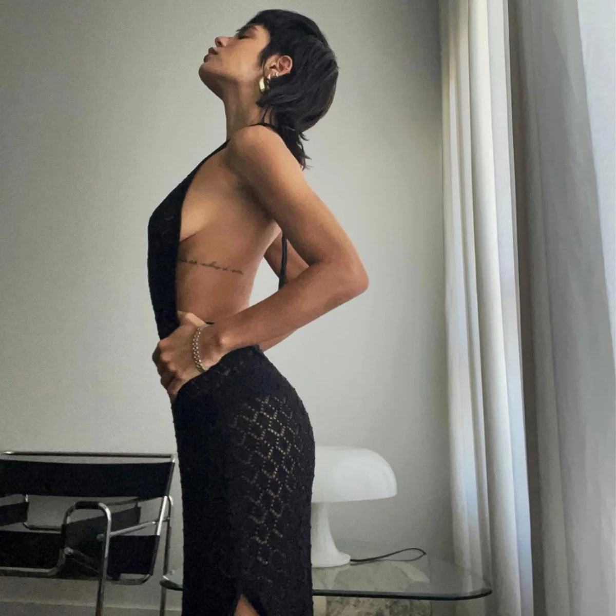 Длинное женское трикотажное платье с открытой спиной, с лямкой чере...