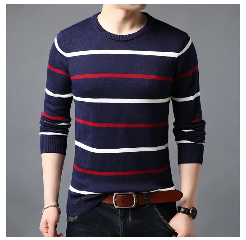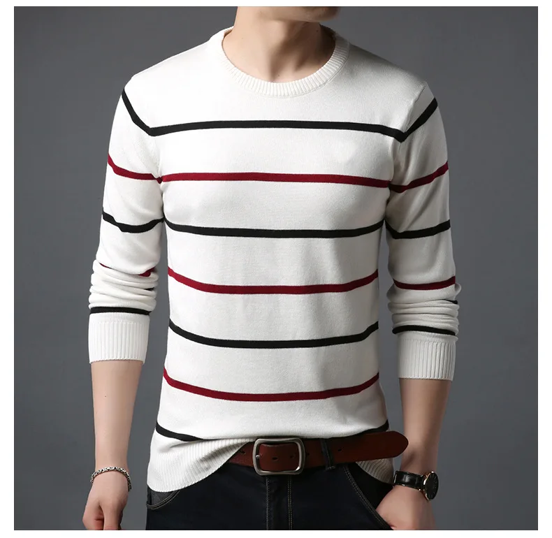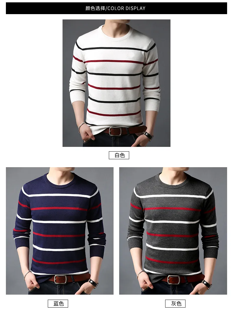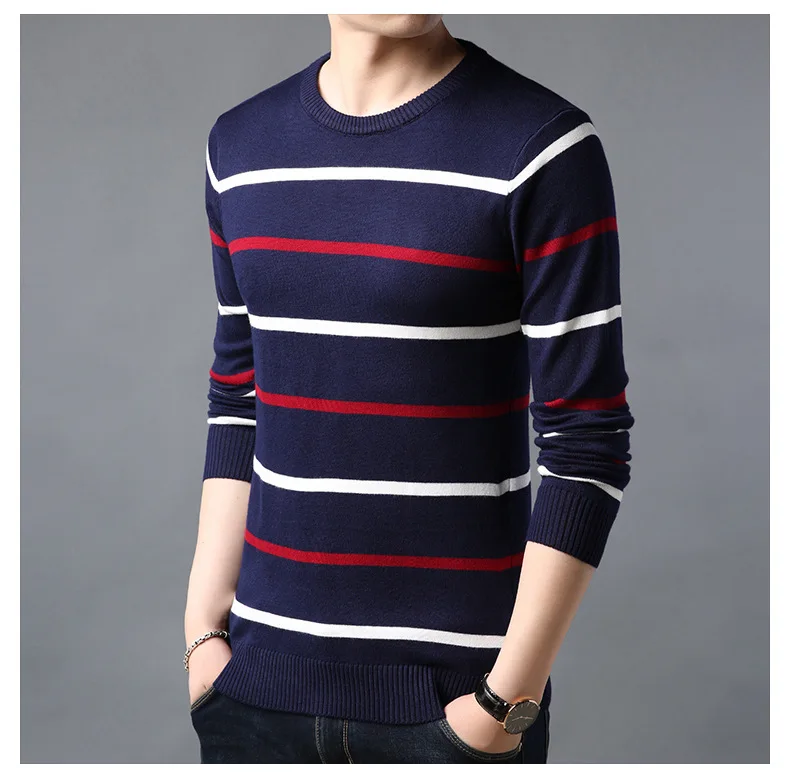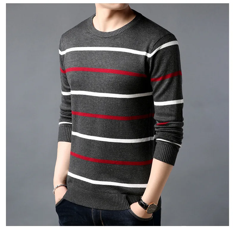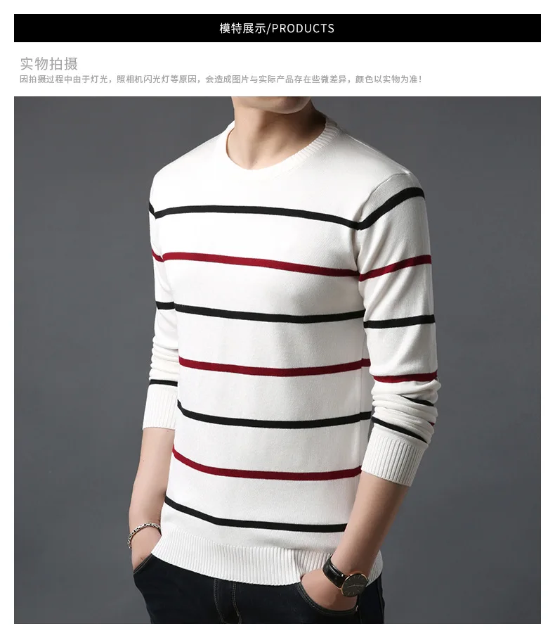 Кашемировый шерстяной свитер для мужчин, приталенный пуловер в полоску, с круглым вырезом, винно-красный свитер на Рождество, Осень-зима