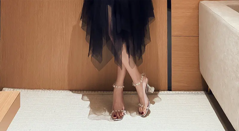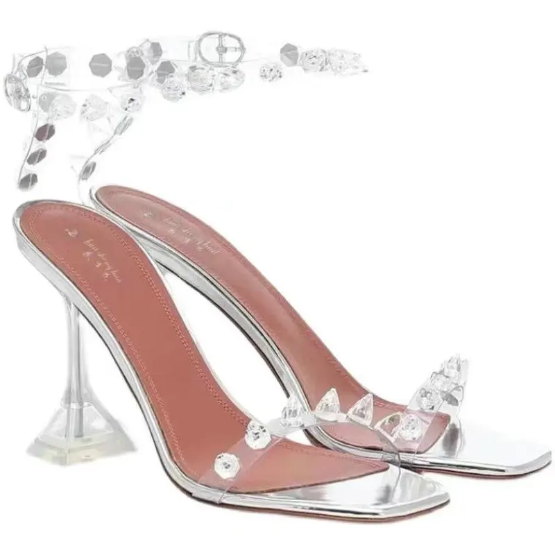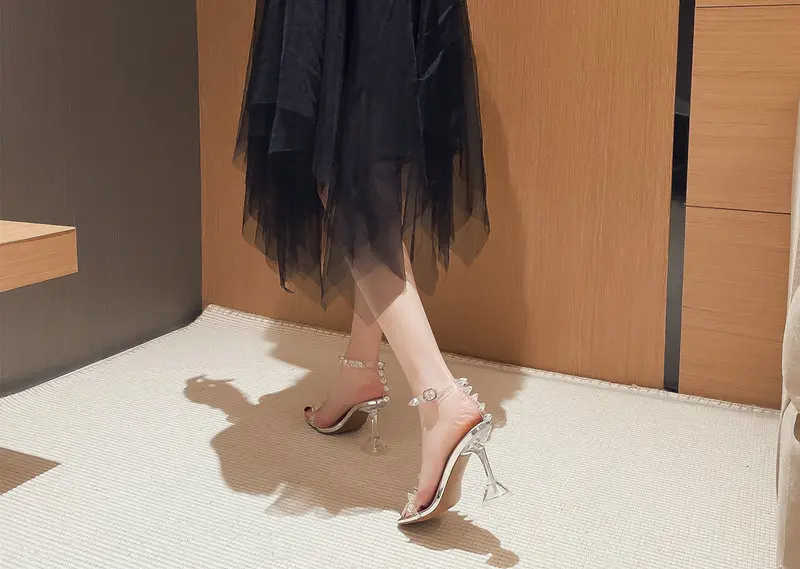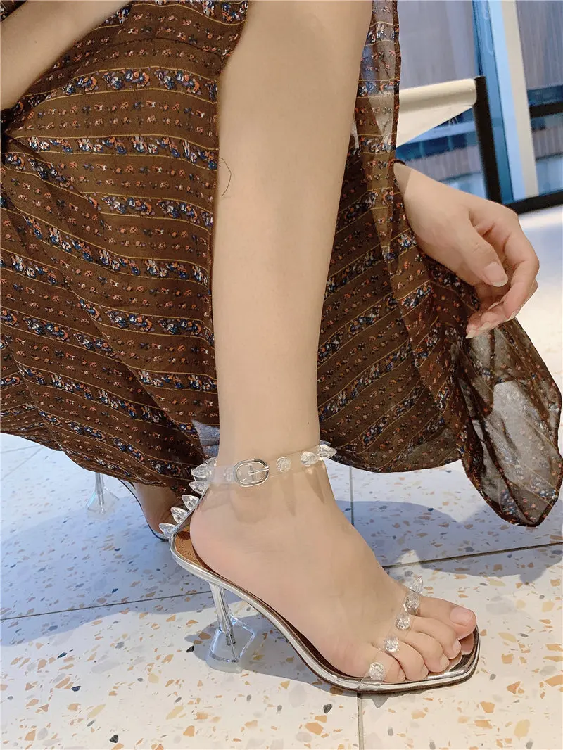 Женские босоножки с кристаллами на высоком каблуке с заклепками, Новинка лета 2021, прозрачные стразы, женская обувь на шпильке