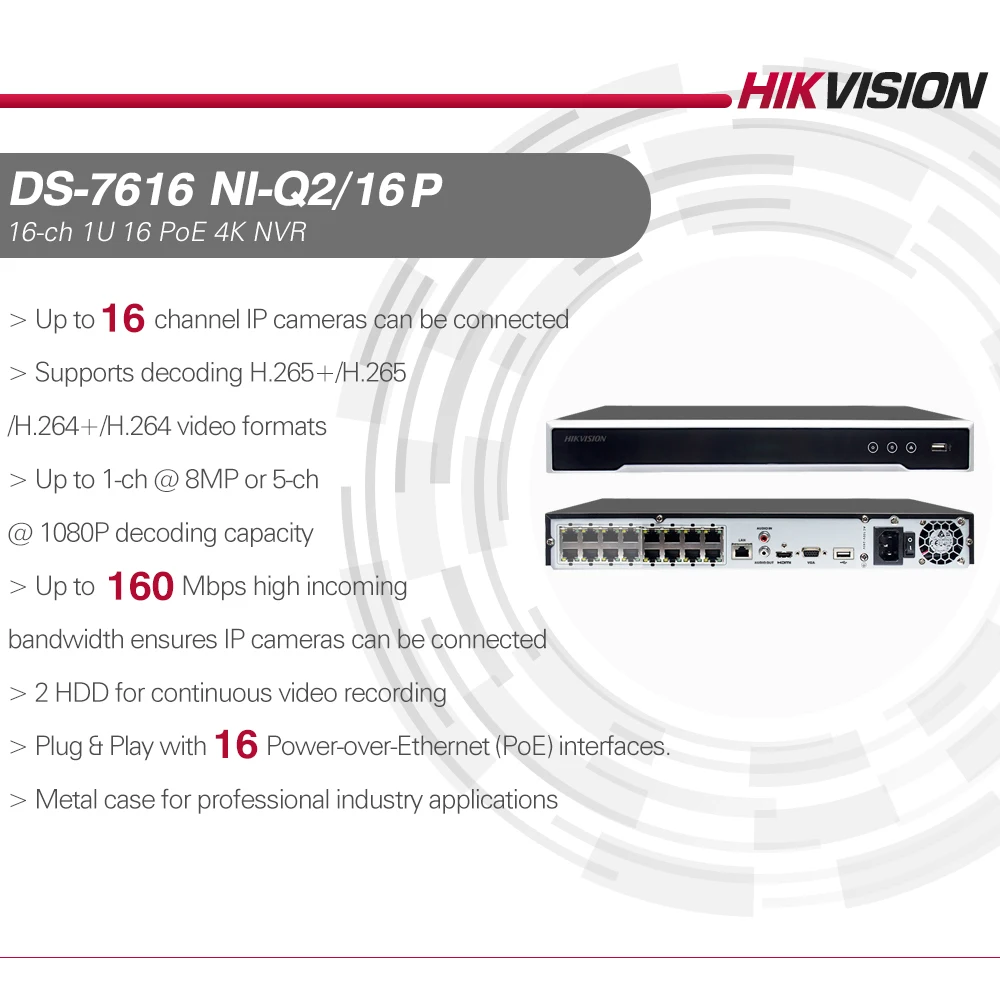 NVR:DS-7616NI-Q2/16P16-ch 1U 16 PoE 4K NVR> Up to 16 channel IP cameras can be connected> Supports decoding H.265+/H.265/H.264+/H.264 video formats> Up to 1-ch @ 8MP or 5-ch @ 1080P decoding capacity> Up to 160 Mbps high incoming bandwidth ensures IP cameras can be connected> 2 HDD for continuous video recording> Plug & Play with 16 Power-over-Ethernet (PoE) interfaces.> Metal case for professional industry applications
