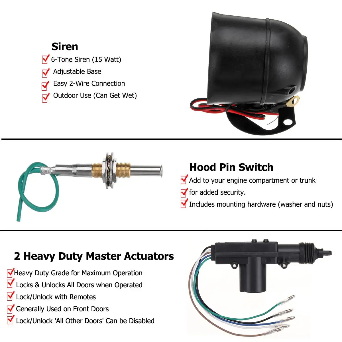 Дистанционный автомобильный сигнализатор без ключа для безопасности входа + 4 дверный силовой ЗАМОК ПРИВОД комплект двигателяСпецификация:Состояние: новоеМодель: FAI-330 и FAI-586Название продукта: Автомобильная сигнализацияЦвет: как на фотоМатериал: металл, пластикХарактеристики: бесключевая записьКоличество пультов в комплекте: 2Количество приводов замка: 4MPN: FAI-586 и FAI-330Мобильность:Представляем автомобильную сигнализацию «Do-It-Yourself» с БЕСКЛЮЧЕВОЙ системой входа. В комплект входят 4 дверных замка. С двумя включенными основными приводами, вы сможете автоматически блокировать и разблокировать все двери, когда вы запираете или разблокируете одну из двух передних дверей. Когда вы запираете или разблокируете свои передние двери, все другие двери автоматически запираются или разблокируются! Эта функция может быть включена или отключена для обеих передних дверей. Вы также будете иметь возможность блокировки и разблокировки вашего автомобиля с обоих 4-кнопочный пультов!Особенности:Этот комплект имеет функцию поиска автомобиля, которая будет мигать огни на вашем автомобиле.Добавьте реле, и он также покроет ваш рог! Если у вас есть двигатель для открытия багажника, этот комплект позволит вам открыть багажник с помощью пульта ДУ.Наконец, если у вас есть модуль для рулона окна или любой другой аксессуар, который вы хотели бы использовать, этот комплект позволяет управлять до 2 дополнительных устройств с пультом ДУ.Особенности безопасности:1. Стартер KillОтключает транспортное средство от начала работы во время срабатывания сигнализации.2. Сценический ударный датчикНизкие удары заставляют sire n звуковое предупреждение chirps, в то время как большие удары вызывают сигнал тревоги.3. Купольный светильник с задержкой запускаПри включении система сигнализации не будет полностью заряжать сигнализацию до тех пор, пока все двери не будут закрыты.4. Триггер зажиганияКогда система сигнализации будет вооружена, сигнал будет звучать, если зажигание получает питание/блокируется.5. Штифт и/или триггер багажникаКогда система сигнализации будет вооружена, будильник будет звучать, если крышка и/или багажник будут открыты.6. Режим карджекаЕсли ваш автомобиль взломан, Включите эту функцию, и будильник будет звучать через 60 секунд после его кражи.7. Режим ValetПри включении пульты запирают и разблокируют двери, не заряжая будильник.Дверной замок и контроль1. Управление передней блокировкойПри блокировке или разблокировке передних дверей все остальные двери будут блокироваться и разблокироваться.Эта функция может быть включена только для одной, обеих или ни для передней двери.2. Автоматический замок/разблокировкаПри включении двери автоматически блокируются и разблокируются при включении и выключении транспортного средства.3. Автоматическая последняя дверьПри включении, после выключения двигателя, сигнал тревоги включится через 30 секунд после выхода из транспортного средства.4.2x вспомогательные выходыЭти вспомогательные выходы могут использоваться для открытия багажника, сворачивания окон и т. д. (требуются дополнительные модули).Расширенные функции безопасности:1. Обход датчика удараПри обходе дистанционным управлением, будильник будет игнорировать датчик удара, когда система будет вооружена.2. Аварийная сигнализация (по последовательности 