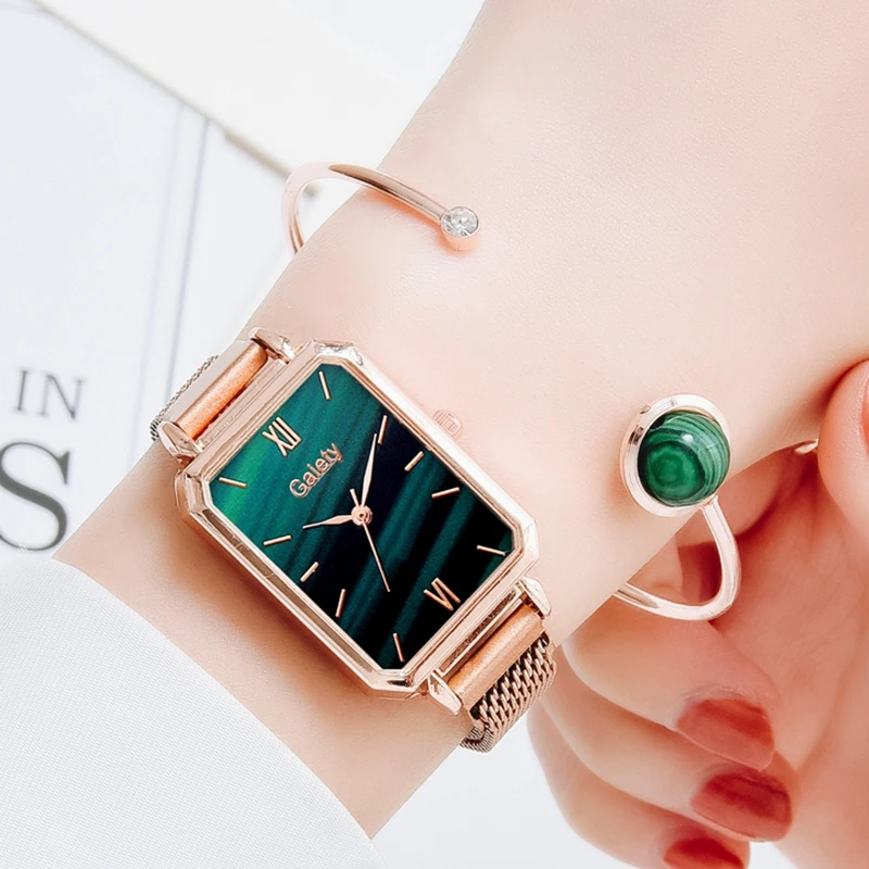 Женские кварцевые часы с браслетом из нержавеющей стали, с квадратным зеленым циферблатом