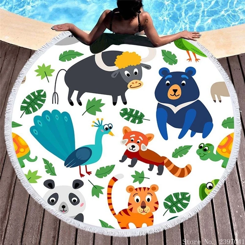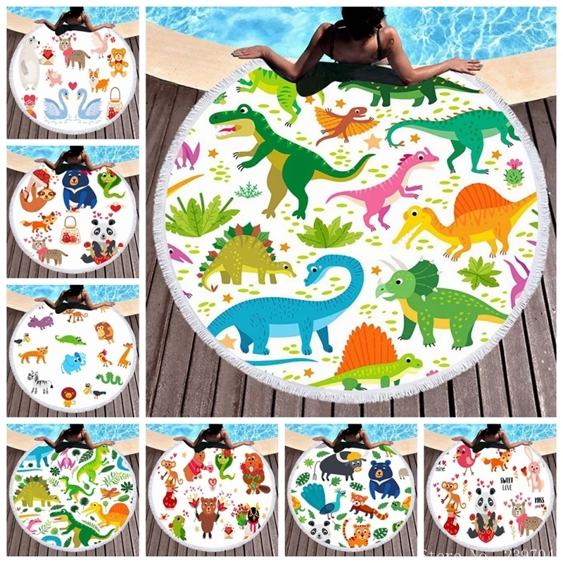 Круглое пляжное полотенце с мультяшным динозавром и кисточками, детские пляжные полотенца из микрофибры с животными для взрослых и детей