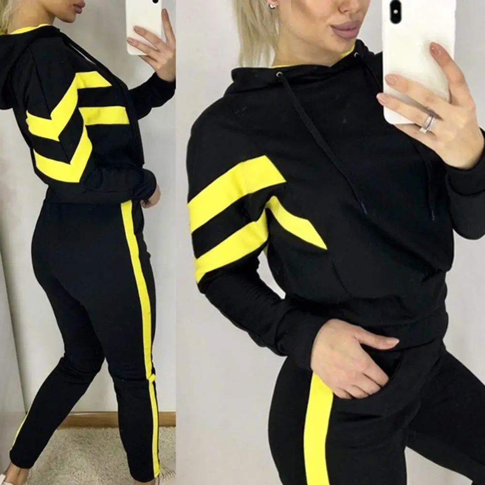 Полосатый Спортивный Повседневный женский короткий пуловер с капюшоном и длинным рукавом, комплект из свитера с брюками