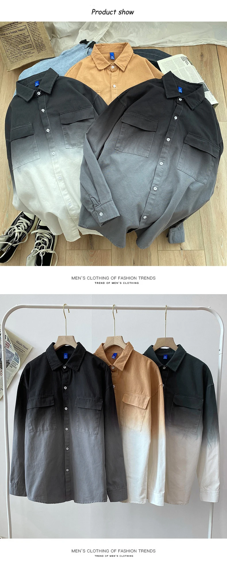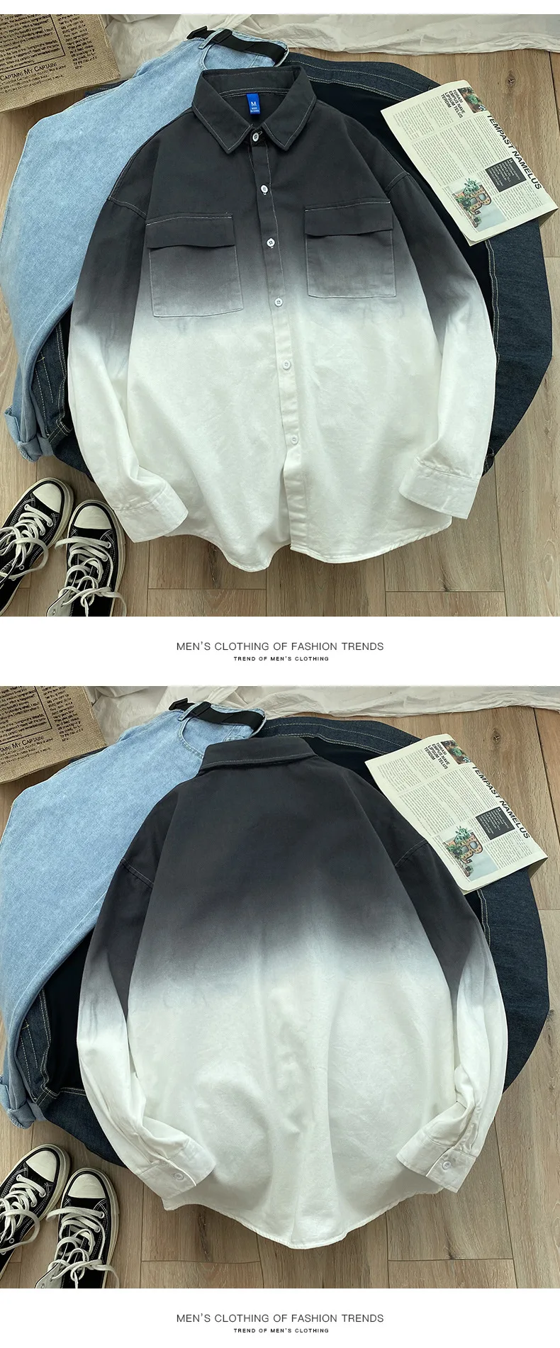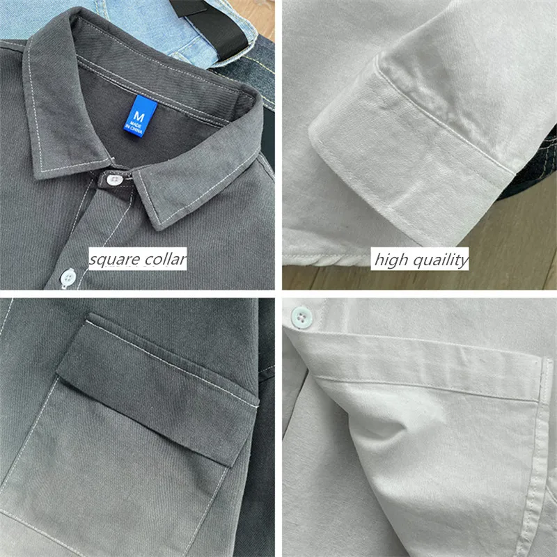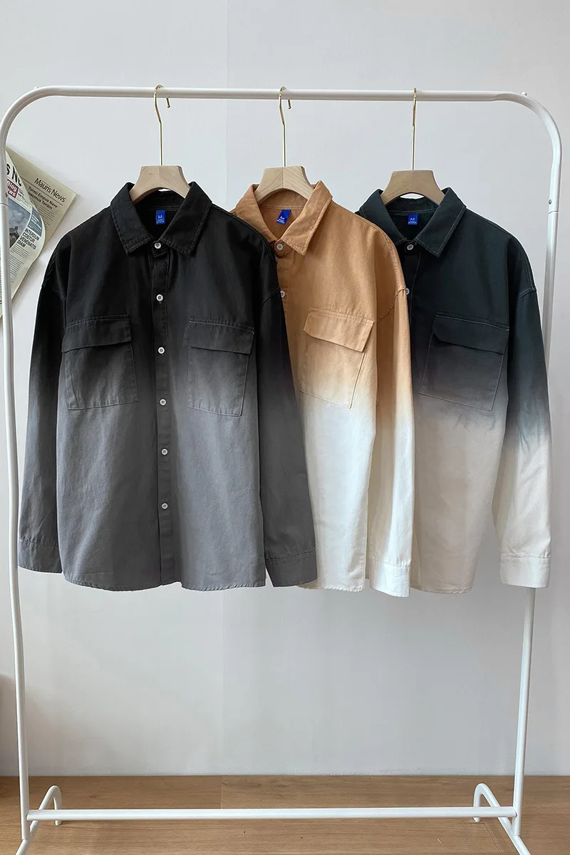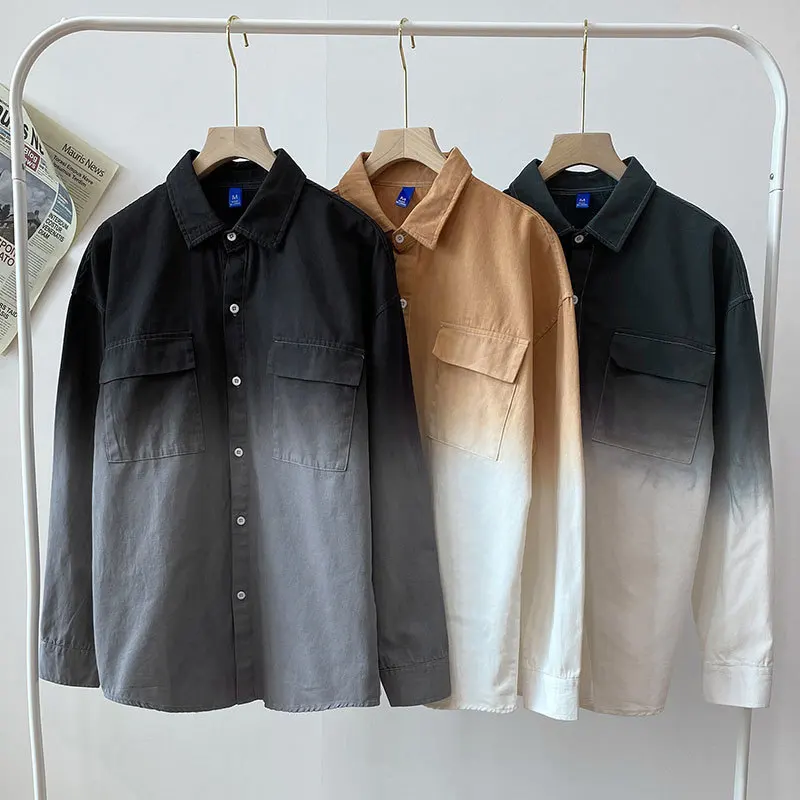Мужская рубашка с длинным рукавом, градиентный цвет, с несколькими карманами, Свободный Повседневный Кардиган в Корейском стиле, популярный бренд размера плюс