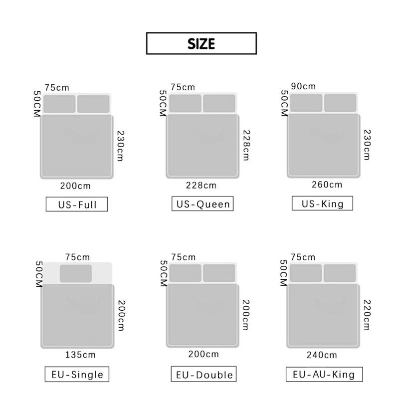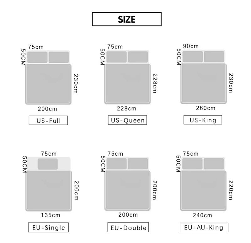 * US-TWIN :1 пододеяльник: 168x229 см 1 наволочка: 50x75 см;США: 1 пододеяльник: 200x230 см 2 наволочки: 50x75 см;США-королева: 1 пододеяльник: 228x228 см 2 наволочки: 50x75 см;US-King:1 пододеяльник: 260x230 см 2 наволочки: 50x90 см;* Европейский стиль: 1 пододеяльник: 135x200 см 1 наволочка: 50x75 см;Европейский размер: 1 пододеяльник: 200x200 см 2 наволочки: 50x75 см;EU-AU-King:1 пододеяльник: 220x240 см 2 наволочки: 50x75 см;