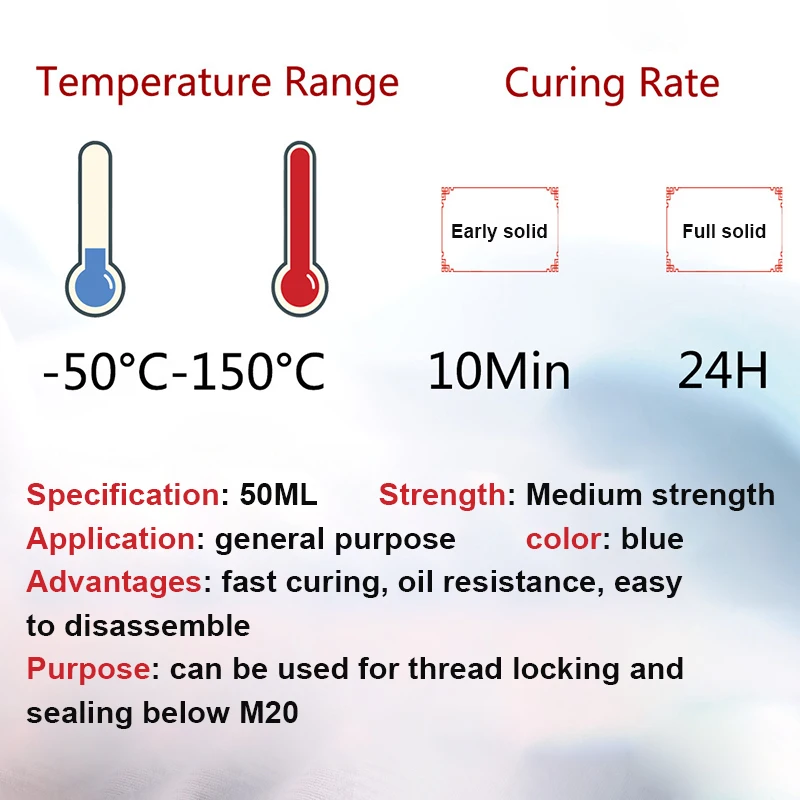Особенности:1. Клей с резьбой-Средняя прочность. Общего назначения. Подходит для всех металлических резьбовых узлов.2. Это универсальный шкафчик средней прочности.3. Этот threadlocker обеспечивает и уплотняет болты, гайки и шпильки, чтобы предотвратить ослабление из-за вибрации.4. Продукт работает на всех металлах, включая пассивные подложки, такие как нержавеющая сталь, алюминий и покрытые поверхности.5.Позвольте винту не упасть во время операции, с другой стороны, он имеет антикоррозийный эффект.Спецификация:Нетто: 50 млСрок действия: 1 год спустяКак использовать: Равномерно нанесите на винт, чтобы затянуть гайку и подождите 24 часа, чтобы полностью вылечиться.