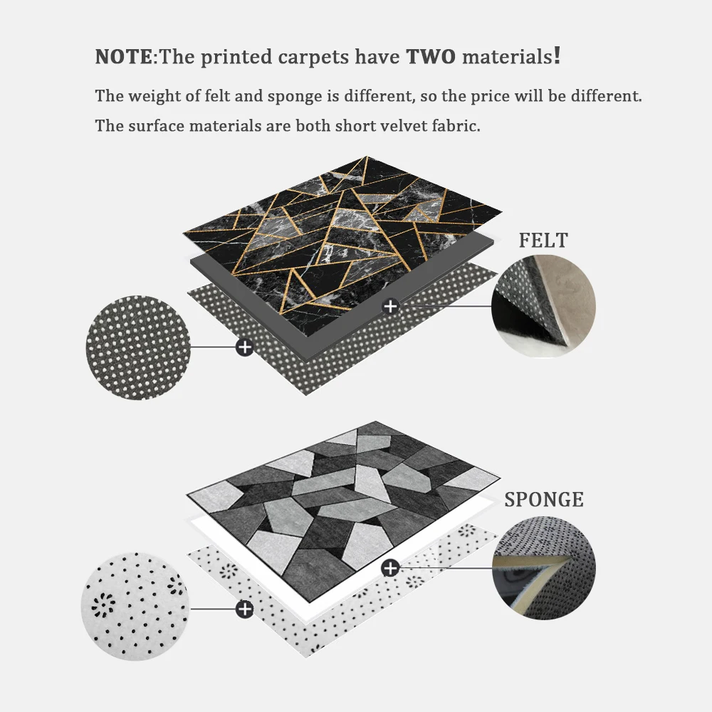 Примечание: ковры с принтом из двух материалов!Вес войлока и губки отличается, поэтому цена будет отличаться.Поверхностные материалы-это короткая бархатная ткань.