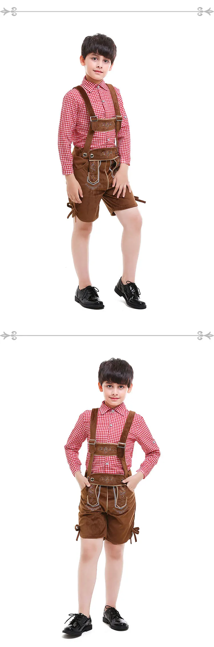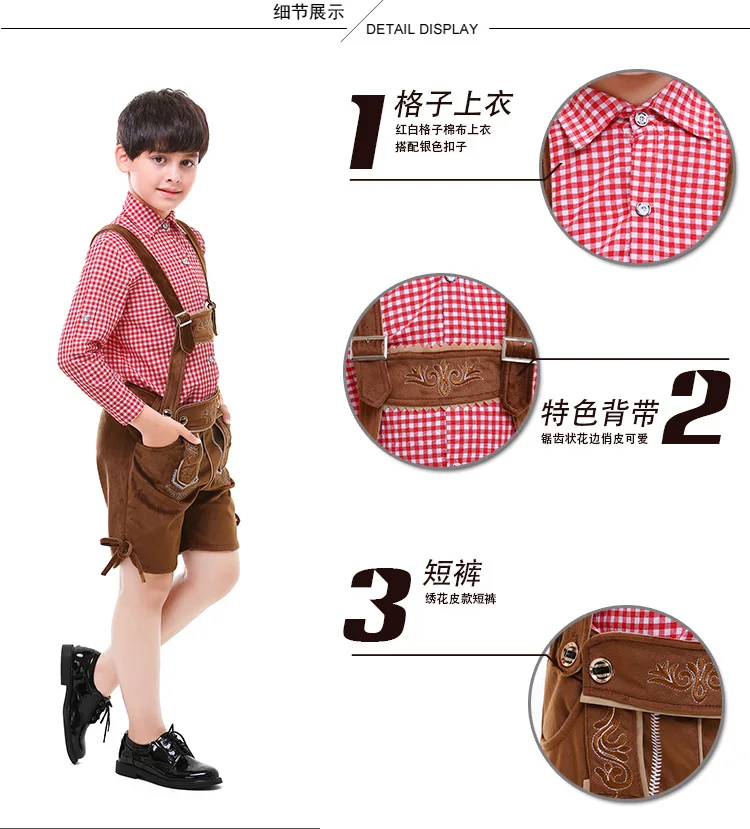 Материал-высококачественное полиэфирное волокно Включая рубашку + подтяжки + шорты Праздничный костюм для мальчиков в немецком стиле, с длинными рукавами, с отворотами, рубашка в клетку, темно-коричневые шорты до колена со специальным ремнем, Классические шорты с обеих сторон на шнуровке, украшенные декоративной деталью Случаи-идеально подходит для Bavaria's Oktoberfest, карнавал, вечерние платья и т. Д.