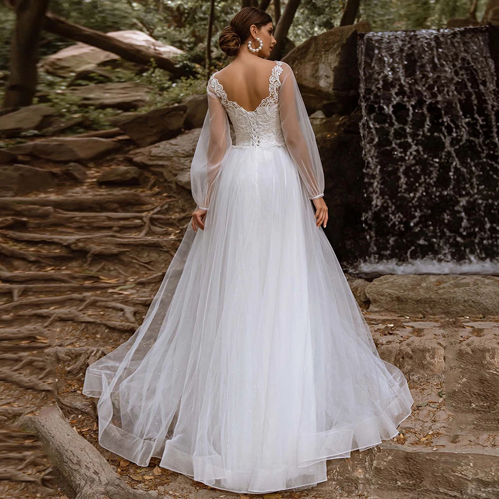 Платье с длинными рукавами-фонариками, свадебные платья 2021 прозрачные с О-образным вырезом с кружевной аппликацией до пола для Длина с низким вырезом на спине платье принцессы с юбкой-пачкой свадебное платье трапециевидной формы