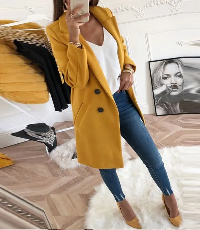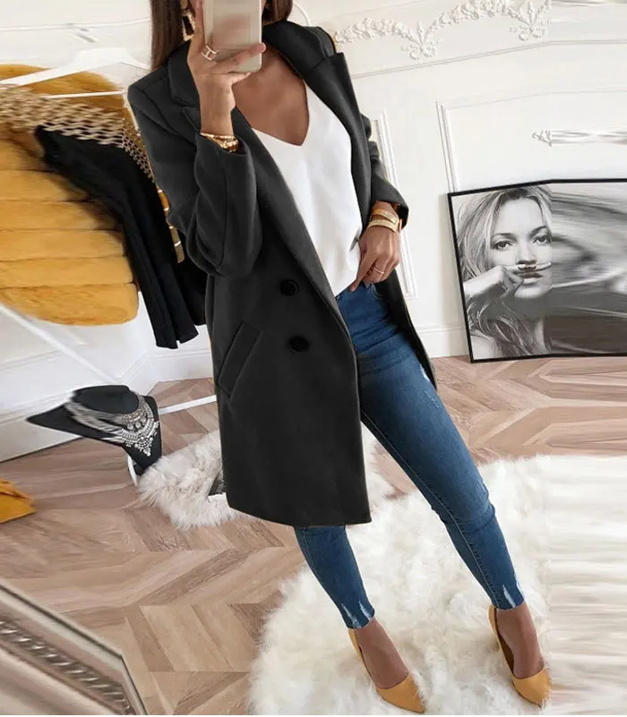 Женское осенне-зимнее шерстяное пальто с длинным рукавом и отложным...