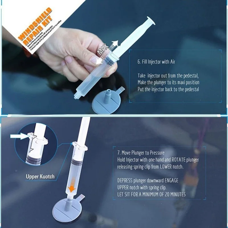 Набор для Ремонта Лобового стекла DIY предназначен для заполнения воздушной полости сильным проникающим клеем, который скрепляет свободное стекло и восстановит видимость.